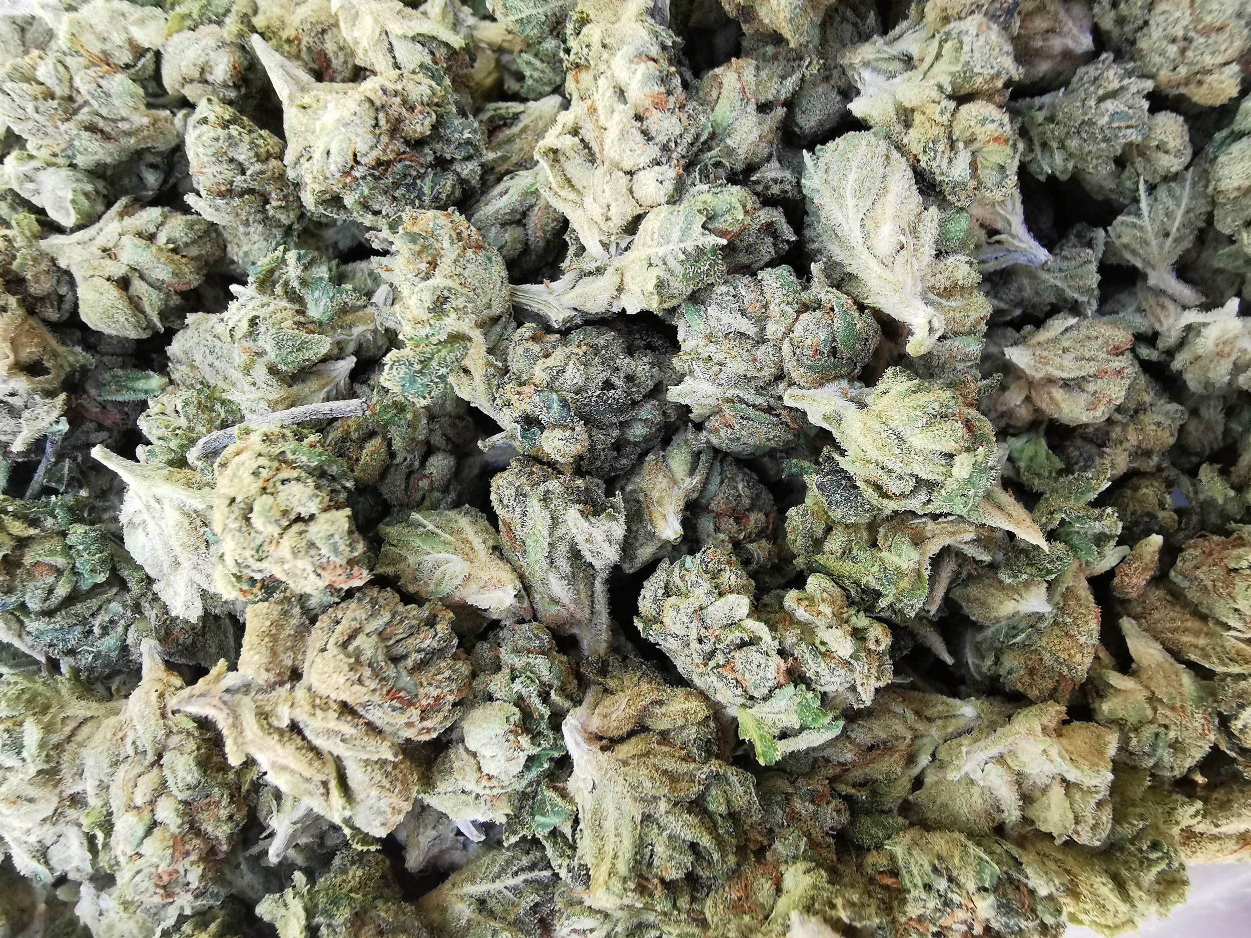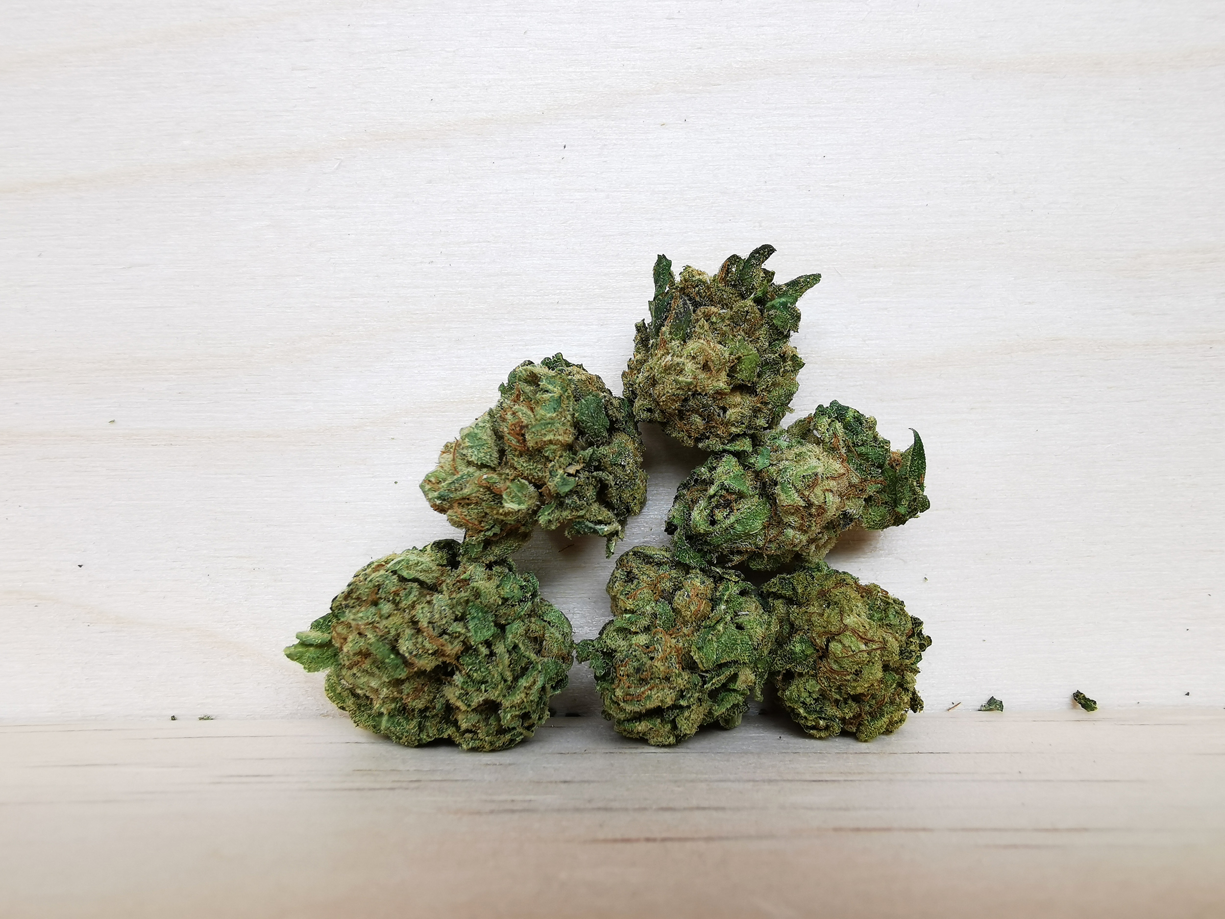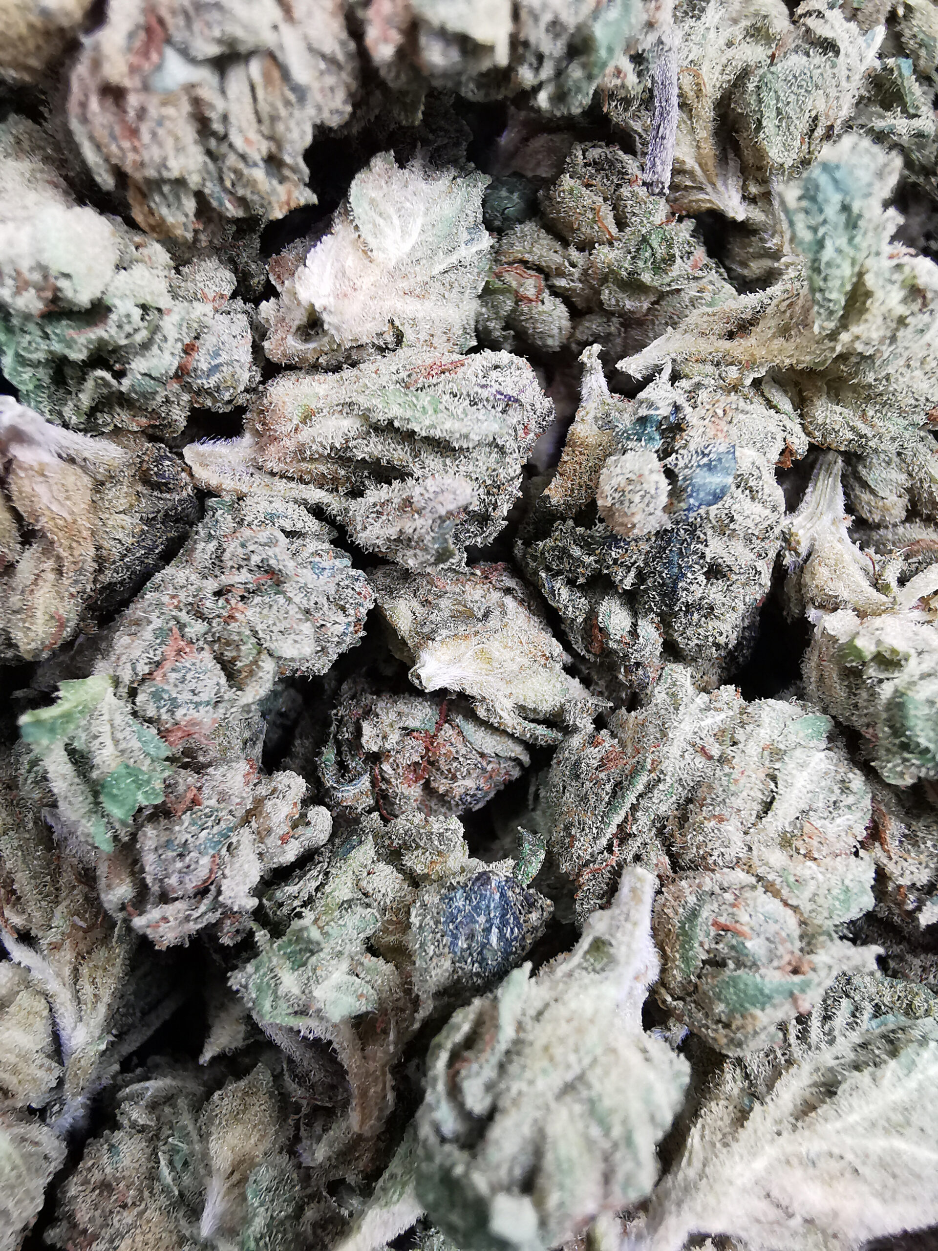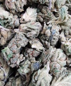 Blue Dream is a slightly sativa dominant hybrid (60% sativa/40% indica) strain that is a potent cross between the hugely popular Blueberry X Haze strains. This infamous bud boasts a moderately high THC level that ranges from 17-24% on average and a myriad of both indica and sativa effects. Users describe the Blue Dream high as having an immediate onset of an uplifting cerebral head high that leaves you completely motivated and focused with waves of creative energy that hit quickly and hard. This is accompanied by a mellow relaxing body high that leaves you warmed, numb, and completely pain free. Due to these potent combination effects, Blue Dream is said to be an ideal strain for treating patients suffering from conditions such as chronic stress, chronic pain due to injury or illness, mild to moderate cases of depression, and sleep disorders, including insomnia. Blue Dream has a delicious aroma of sweet blueberry pie and a taste of sugary sweet blueberries that stays on your tongue long after smoking. This bud has large dense yet fluffy popcorn-shaped bright neon green nugs with amber and blue hairs and rich blue undertones. These nugs are dusted with a fine layer of sandy milky white trichomes and sweet sticky resin.
