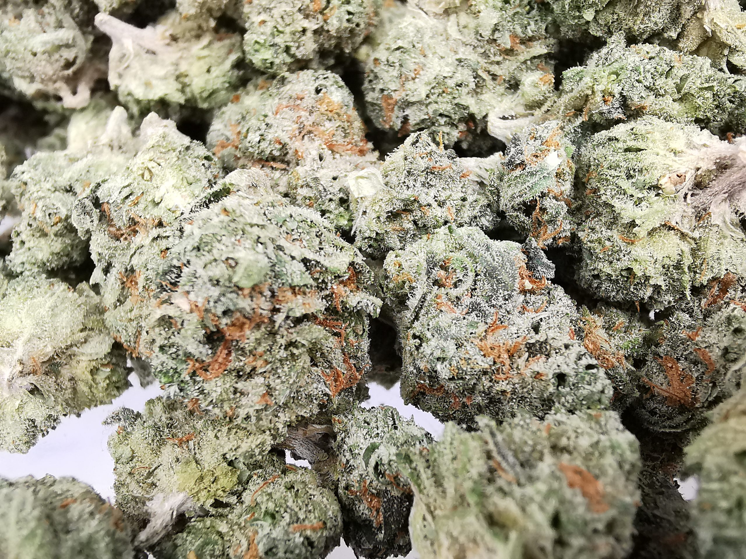 Gorilla Bomb is a rare slightly sativa dominant hybrid strain (60% sativa/40% indica) created through crossing the infamous THC Bomb with a phenotype of Gorilla Glue #4. With Gorilla Bomb, get ready for a super potent high that roars into both mind and body with a hard-hitting potency thanks to its super high 26-31% average THC level. The Gorilla Bomb high explodes in your brain first, launching it into a lifted energetic state that fades in and out of focus. Your body will start to fall into a deeply relaxed tingly state at this point, which quickly turns sedative and leaves you hopelessly couch-locked for hours and hours on end. Thanks to these effects, Gorilla Bomb is often chosen to treat patients suffering from conditions such as chronic pain, mood swings, muscle spasms or cramps, depression, chronic fatigue, and chronic stress. This bud has a super tasty chocolate diesel flavor with a sweet exhale. The aroma is very earthy and pungent with a rich pine overtone accented by fresh diesel and chocolate as the nugs are burned. Gorilla Bomb buds have fluffy small spade-shaped olive green nugs with dark amber hairs and a thick frosty coating of tiny white crystal trichomes.