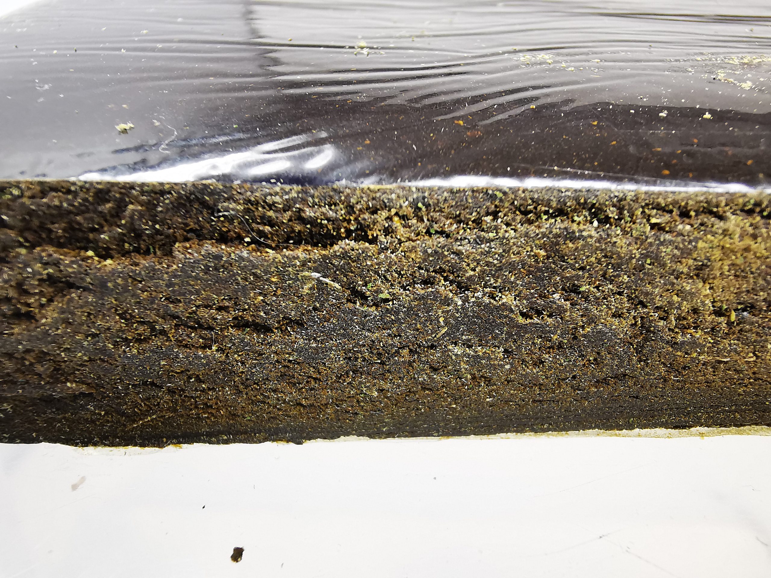 Knowing this is an East-Asian Ice-o-lator hash means that you are gonna be in for something unique. It is thin pressed, rock hard on the outside, yet quite powdery soft once you get it slightly warm and broken up with your fingernail. The outer skin is just barely darker than the interior, which is more “fudgy”.