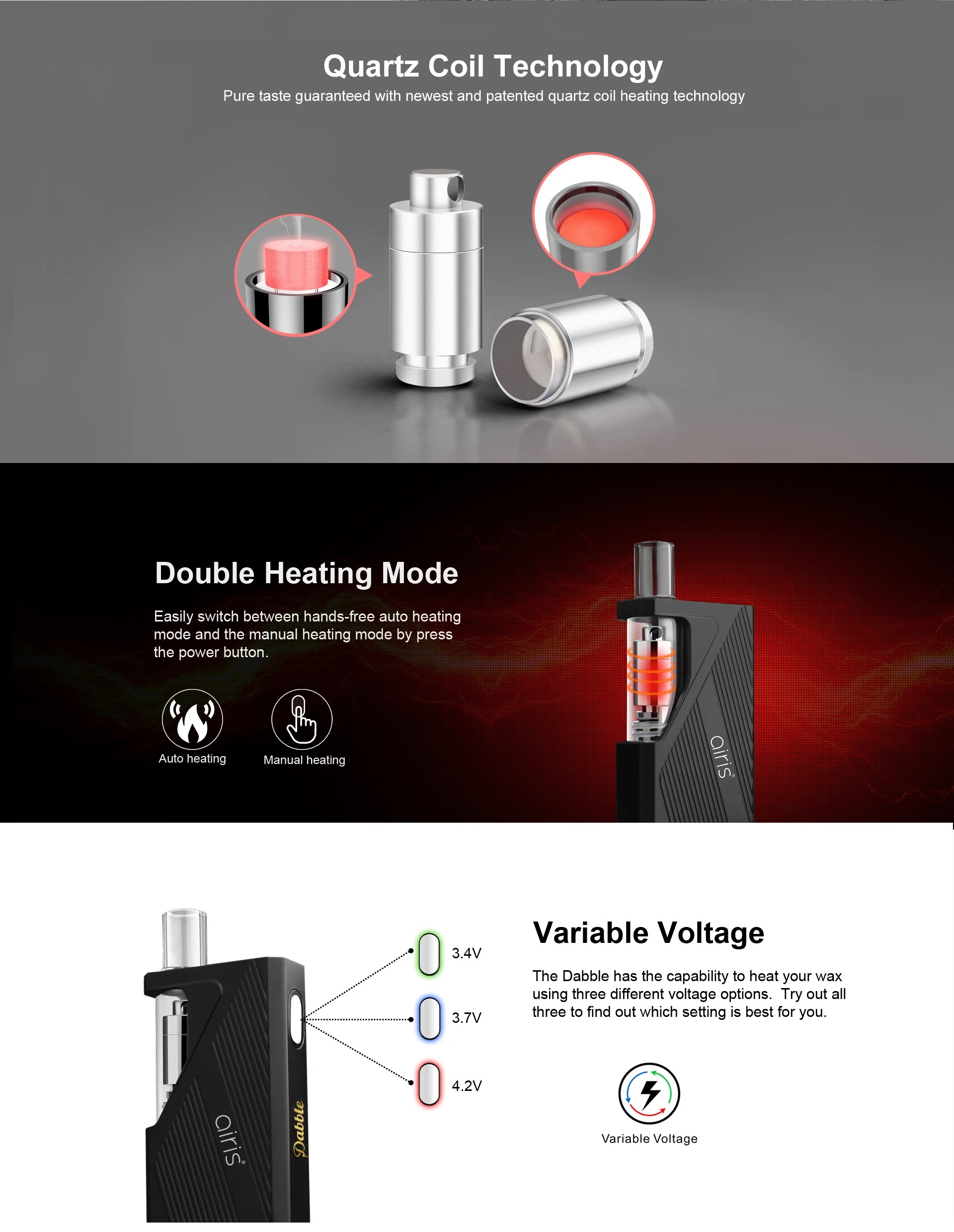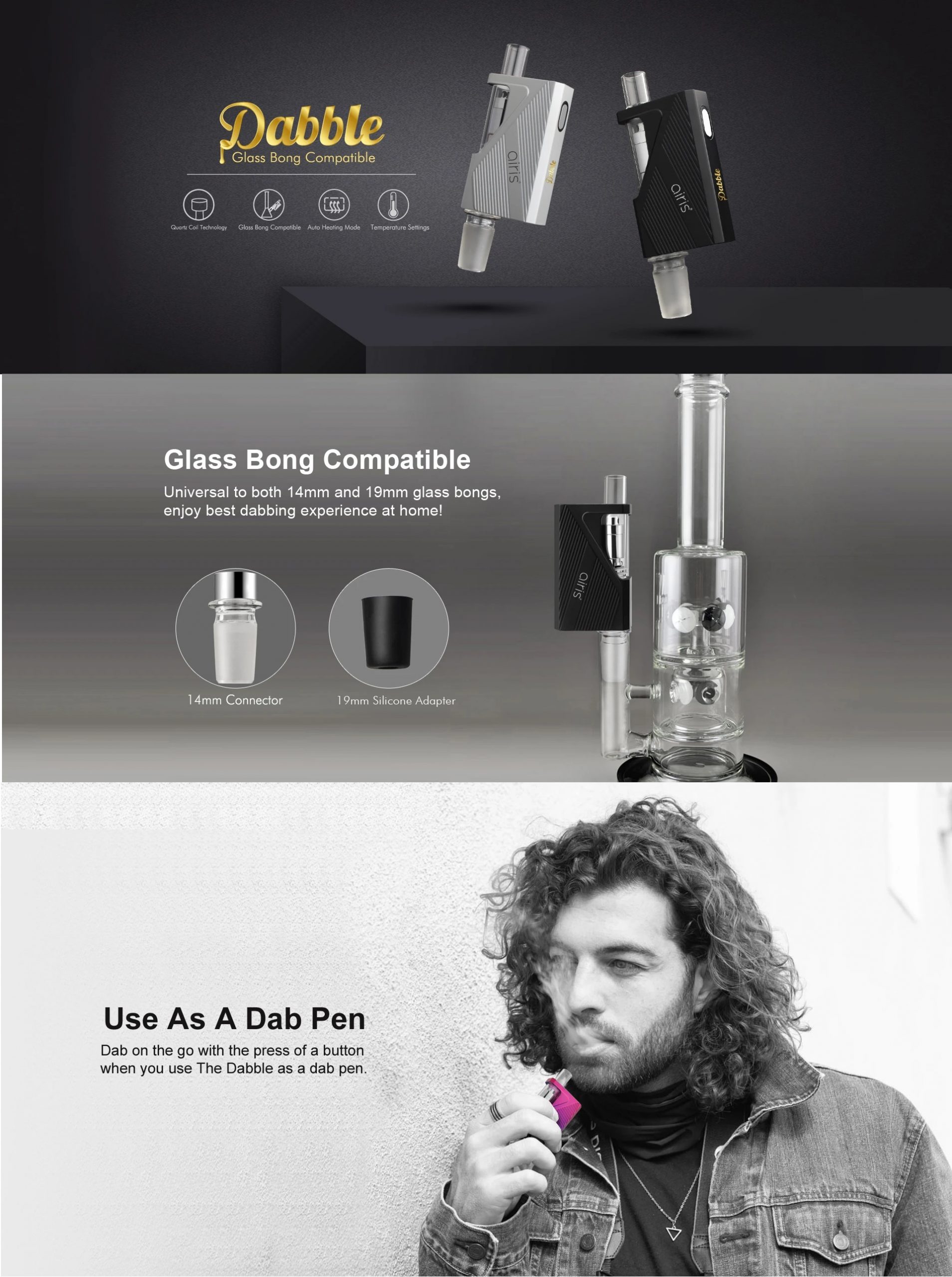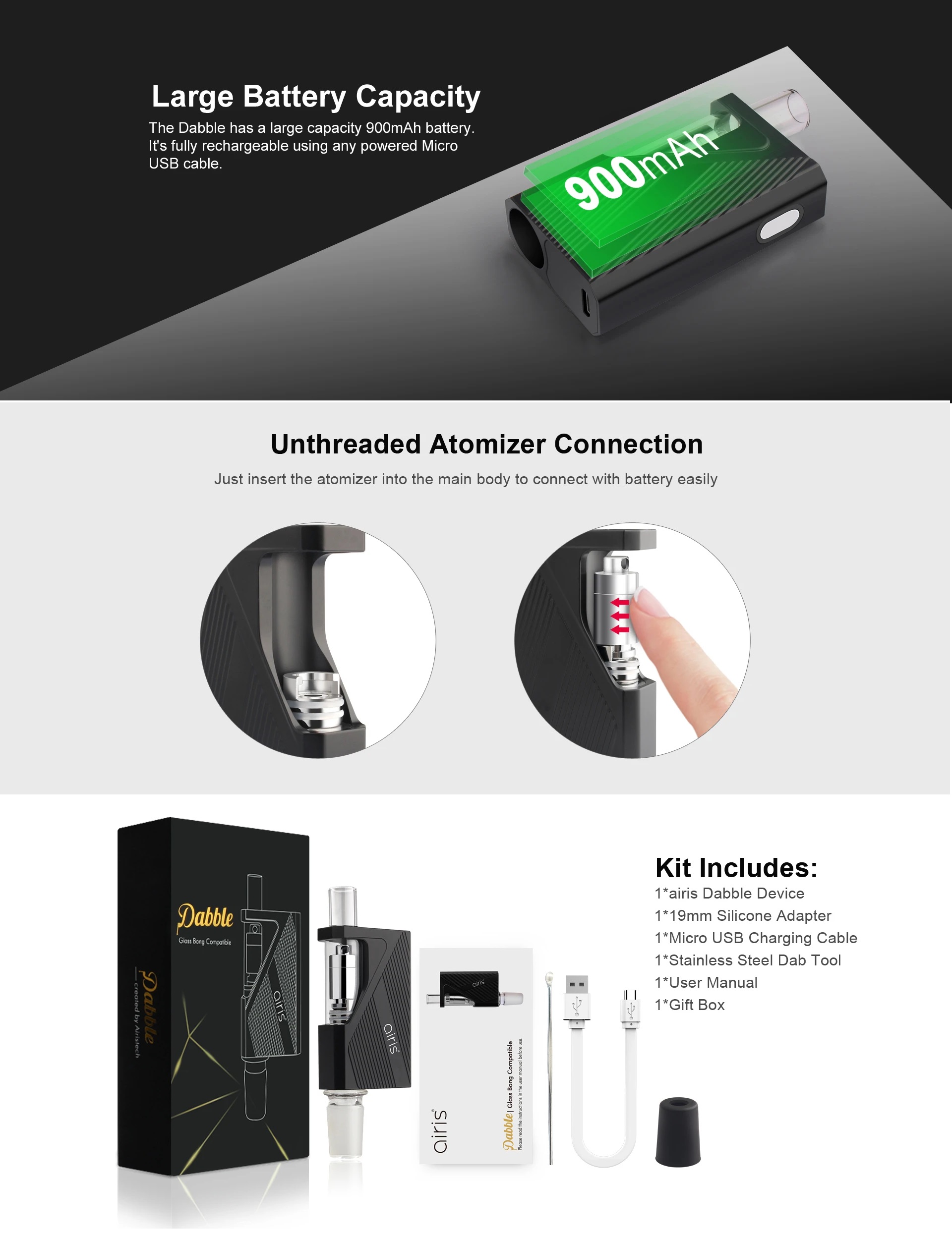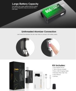 Dabble Vaporizer is a wax concentrate vaporizer kit that comes with 900mAh battery capacity. It is compatible with both 14mm and 19mm glass bongs, so you can enjoy the best dabbing experience at home. With the press of a button, you can use it as a dab pen. It utilizes the Quartz Coil Technology to provide you pure taste. Auto heating mode and manual heating mode are designed for Dabble, you can switch the mode by pressing the power button. It features three different voltage options (3.4V, 3.7V, 4.2V). You can insert the atomizer into the main body to connect with battery easily with the unthreaded atomizer connection.