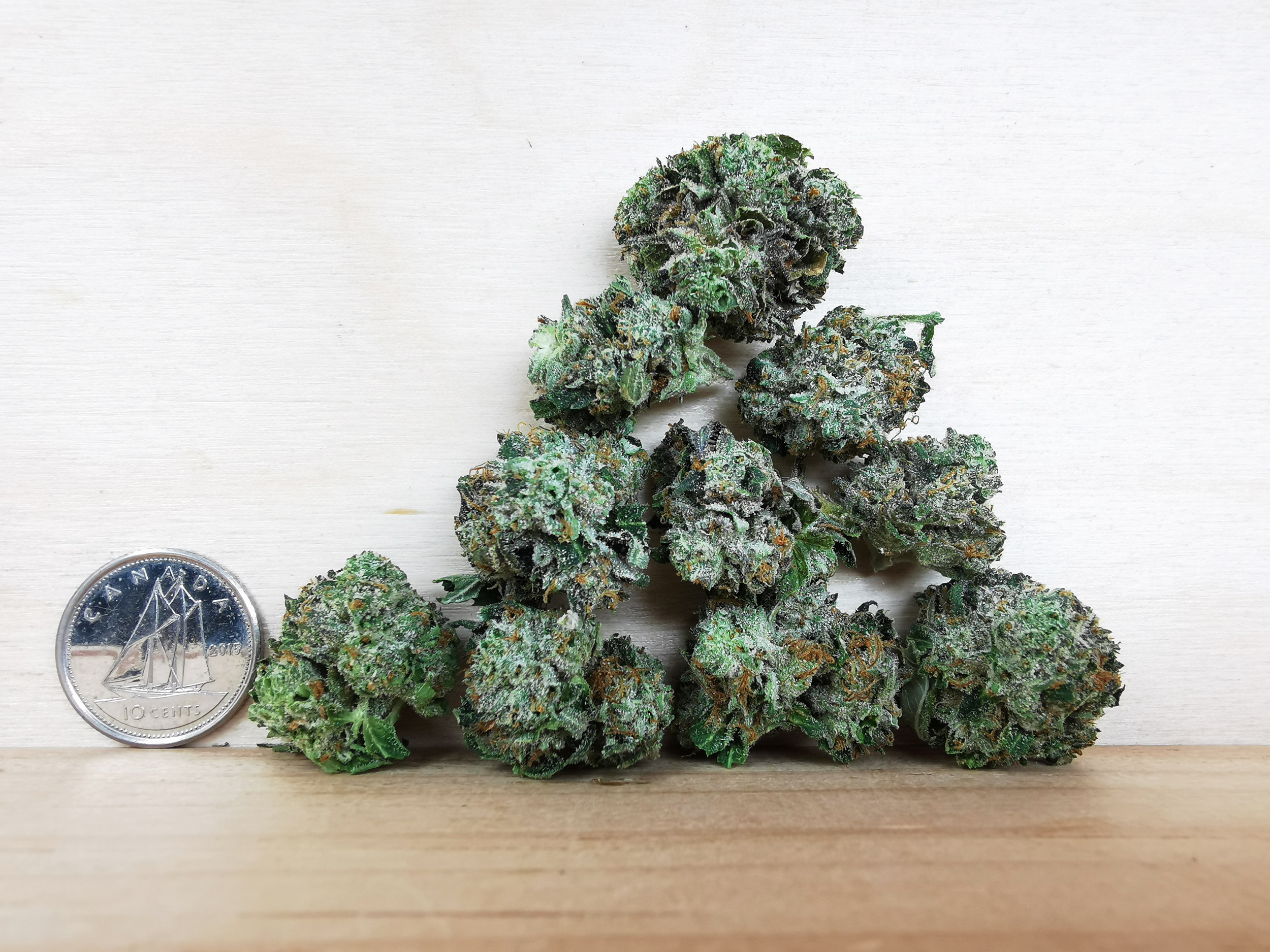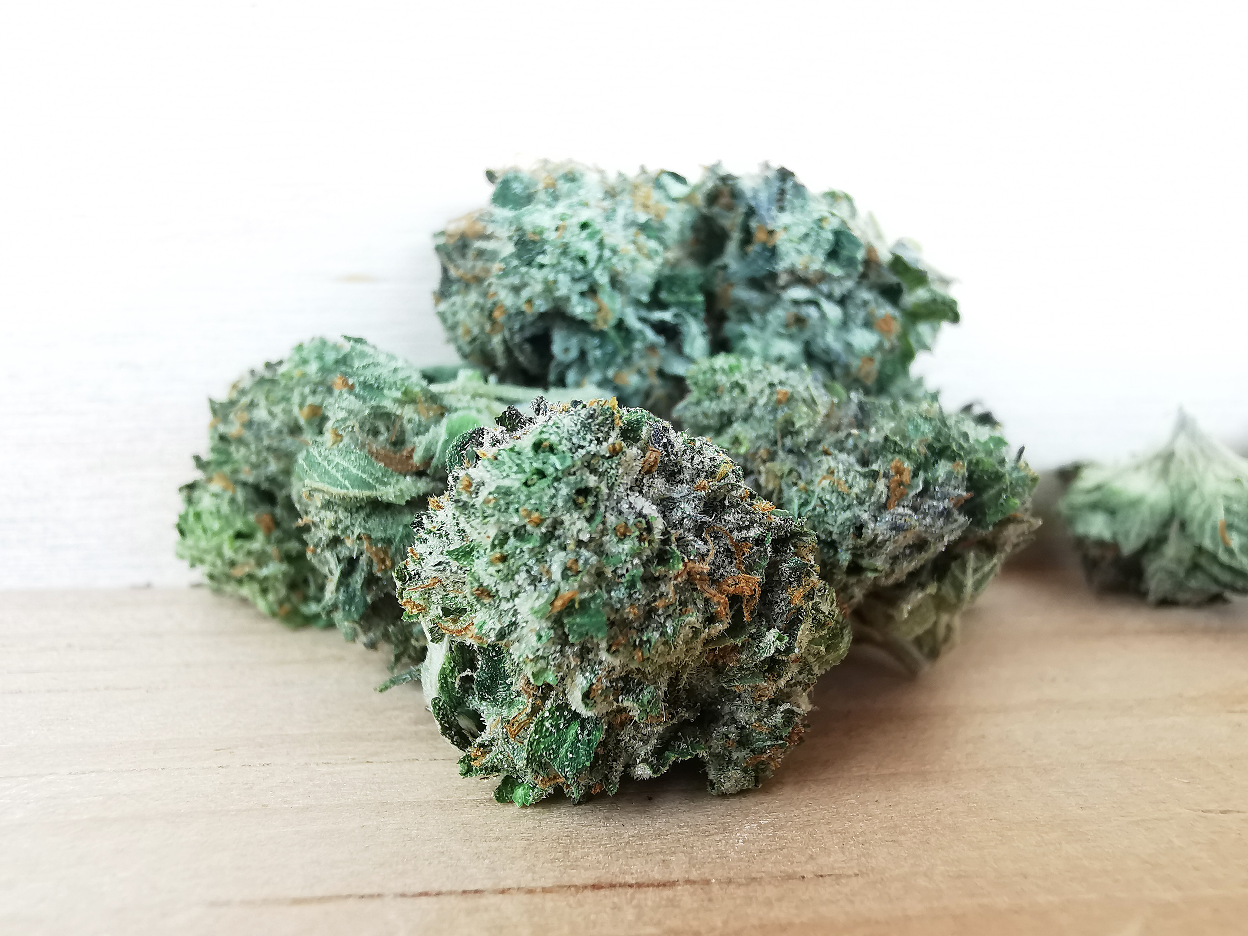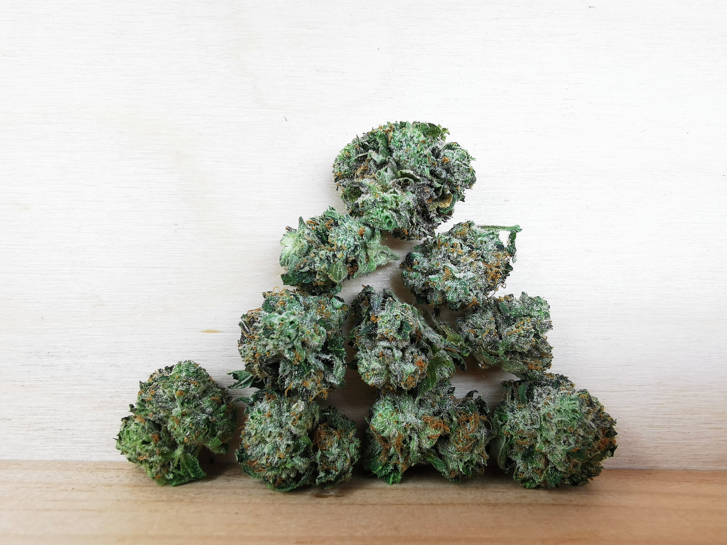 • Buds: Small to medium, light green, dense, and well-coated with shiny trichomes