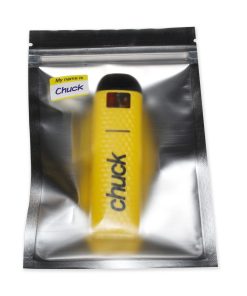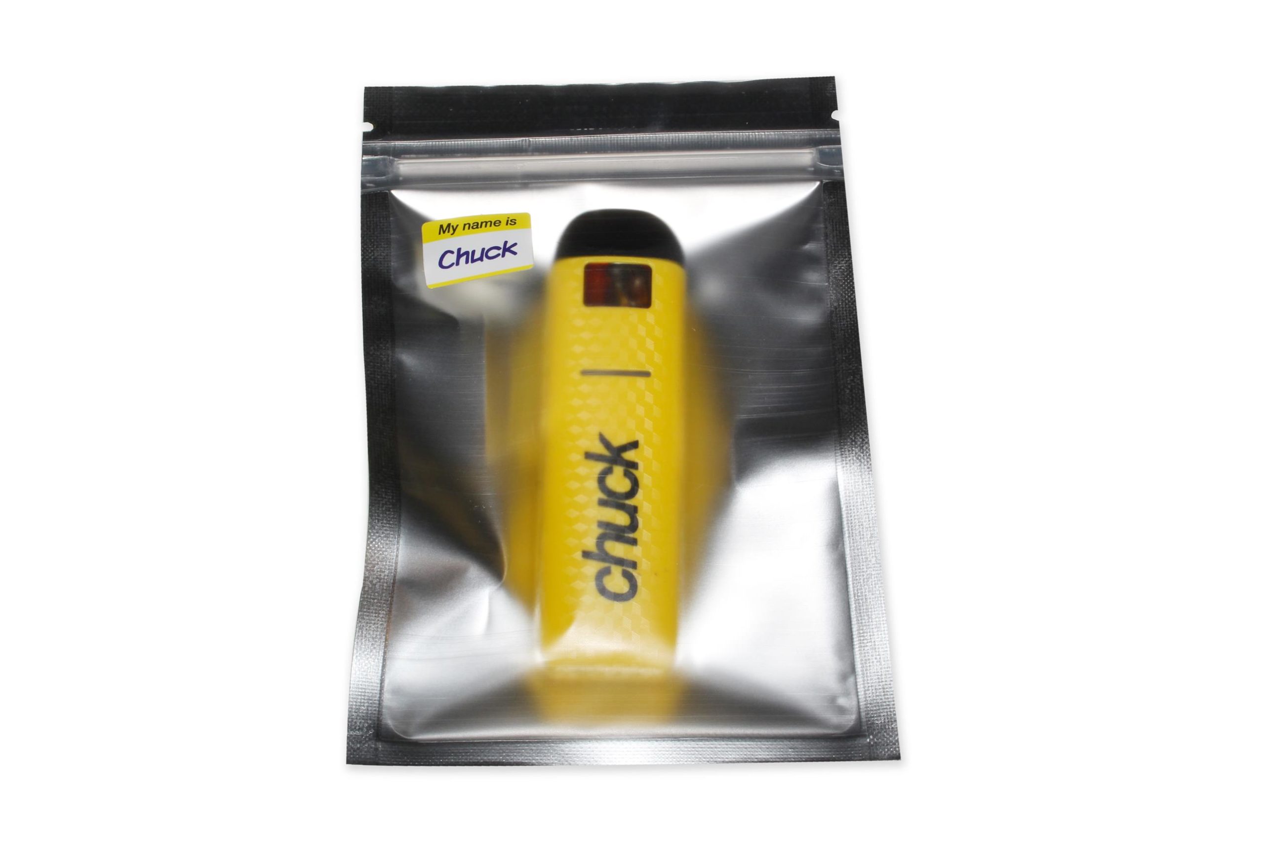 Get it? Disposable? Chuck? Chuck is a little 350mAh disposable loaded with our Skittles mix. About the size of a big lighter – only about a million times cooler, thanks to a carbon-fiberish shell.