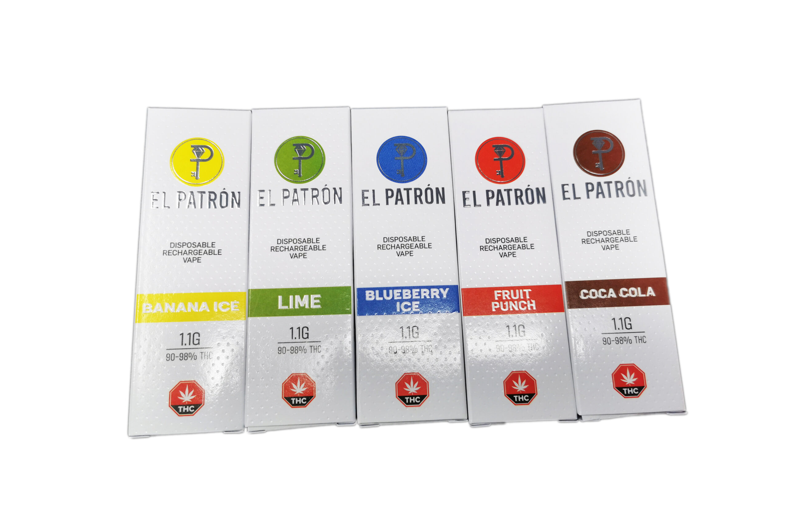 Each disposable pen comes with 1100mg of high quality distillate with added flavour terpenes. Expect big clouds and big flavours with each puff. Distillate is the main ingredient in most vape cartridges and El Patron pens are no different. However, what separates El Patron from other pens is the quality of flavours and the potency from each puff.