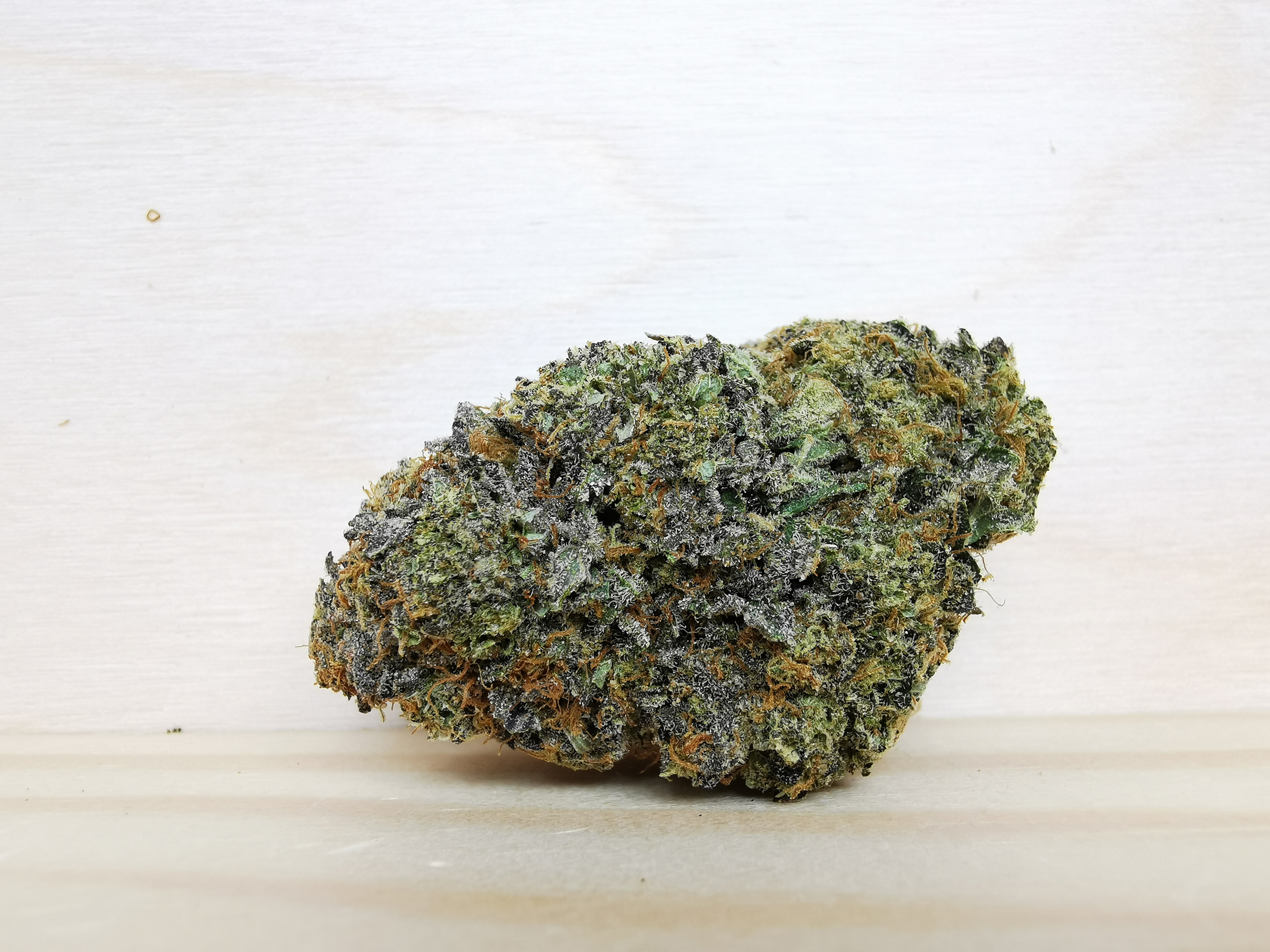 Garlic Cookies is a heavily indica dominant hybrid strain (90% indica/10% sativa) created through crossing the potent Chemdawg X Girl Scout Cookies strains. Infamous for its heavy flavor and hard-hitting effects, this bud is a favorite of indica users around the world. Garlic Cookies has a flavor that, like its name suggests, is reminiscent of garlic with a light cookie diesel effect upon exhale. The aroma is very earthy with a heavy diesel overtone that lingers long after you finish toking. The Garlic Cookies high is much like its Girl Scout Cookies parent, with long-lasting effects that hit both mind and body. You’ll feel a cerebral lift a few minutes after your last toke that fills you with a sense of euphoria and gives you a mild case of the munchies. Soon after, a warming body high will wash over you, leaving you slightly sedated and sleepy at times. With these effects and its super high 30-32% average THC level, Garlic Cookies is said to be perfect for treating conditions such as chronic pain, appetite loss or nausea, depression, and chronic stress. This bud has fluffy oblong yellow green popcorn shaped nugs with orange hairs and a sandy coating of amber crystal trichomes.