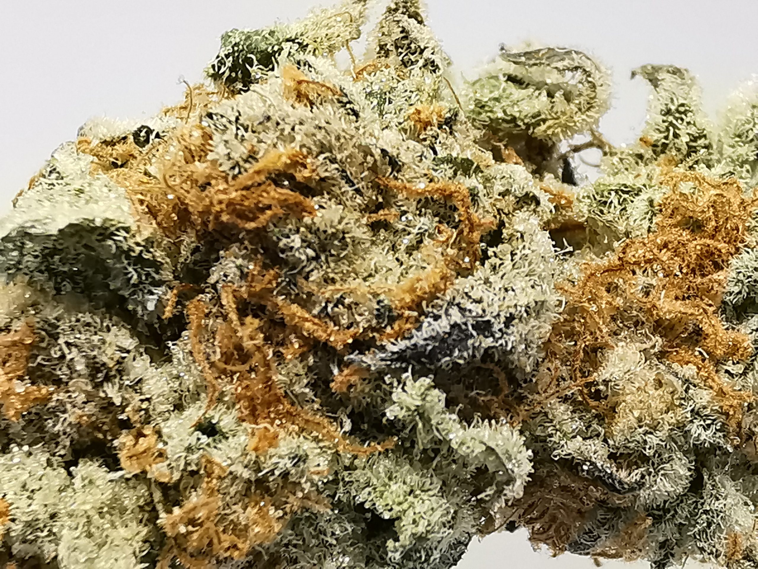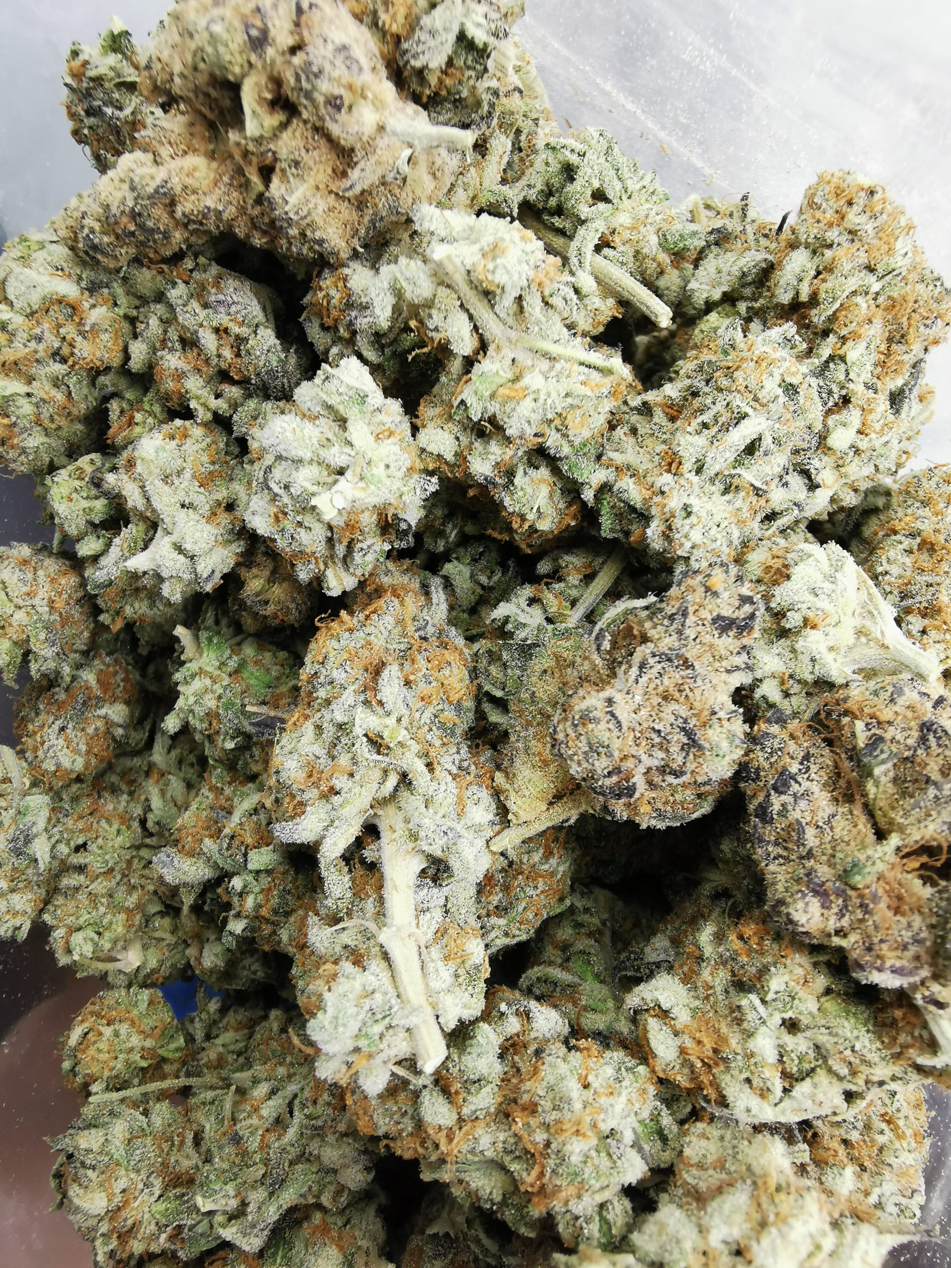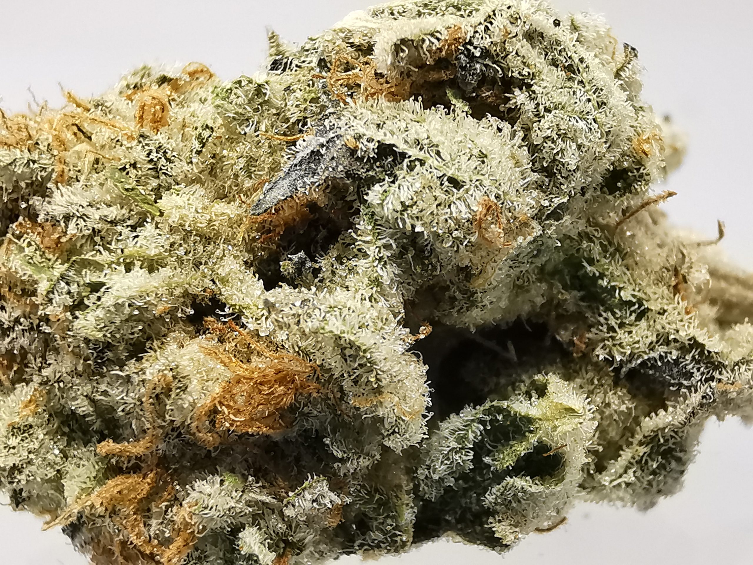 This extremely caked out nugs has long grape-shaped olive green nugs with bright red-orange hairs and a coating of thick frosty white purple-tinted crystal trichomes.