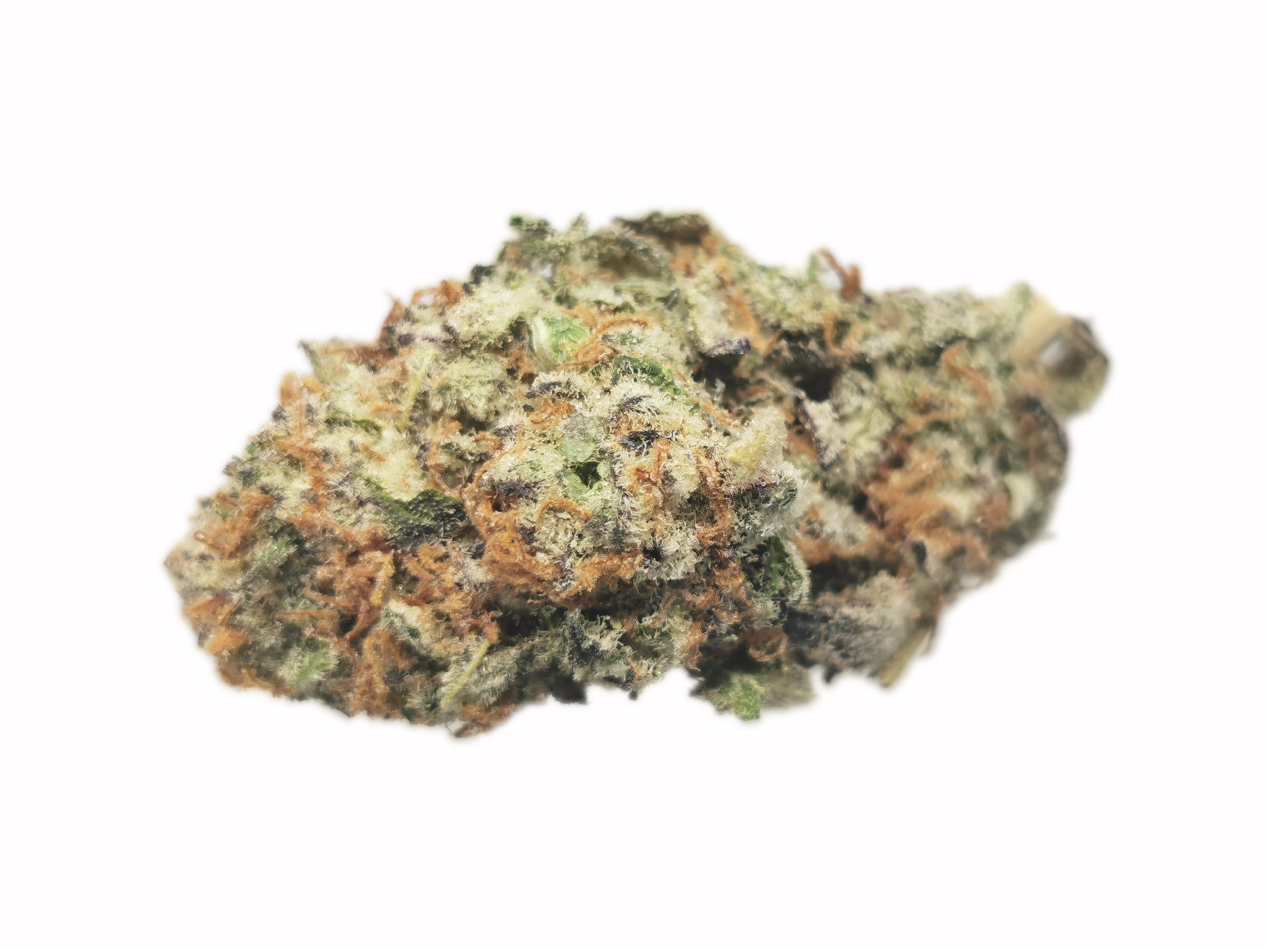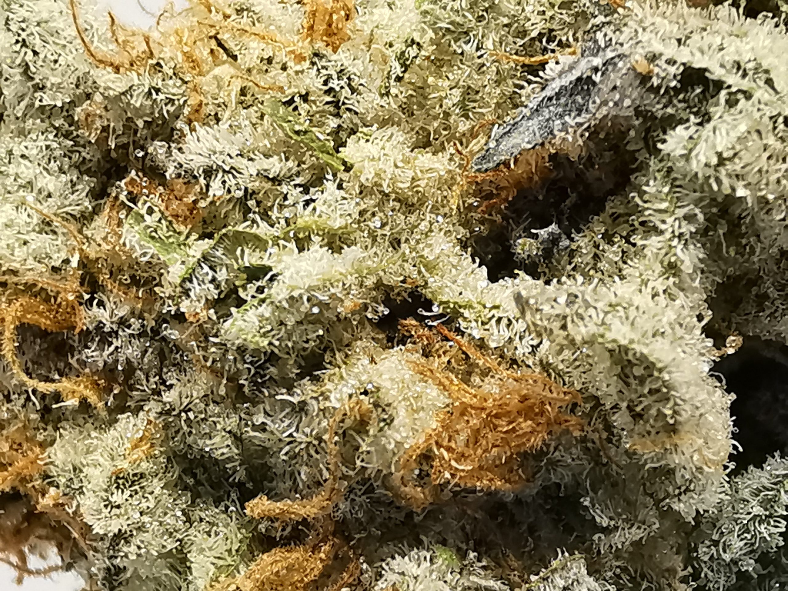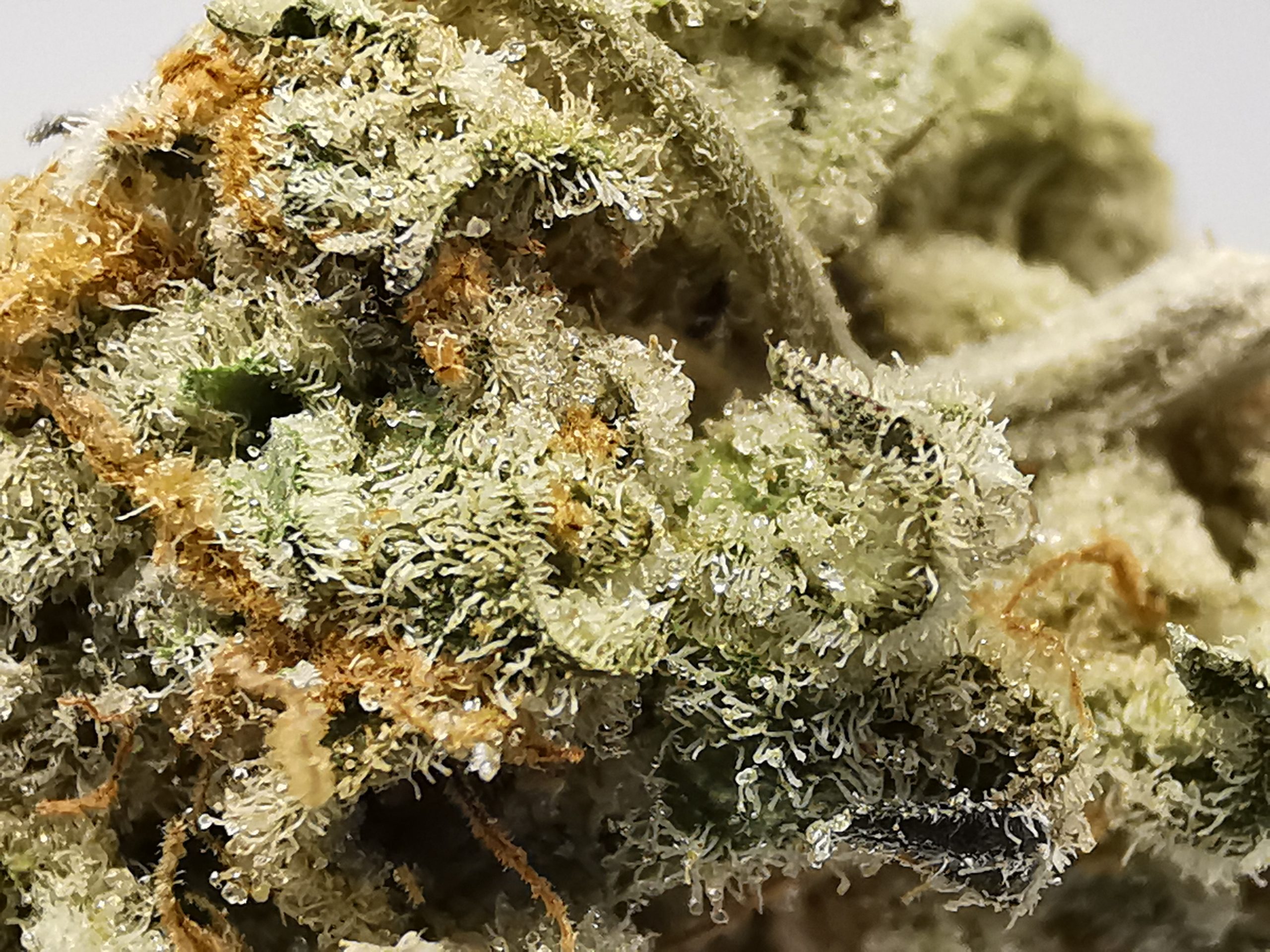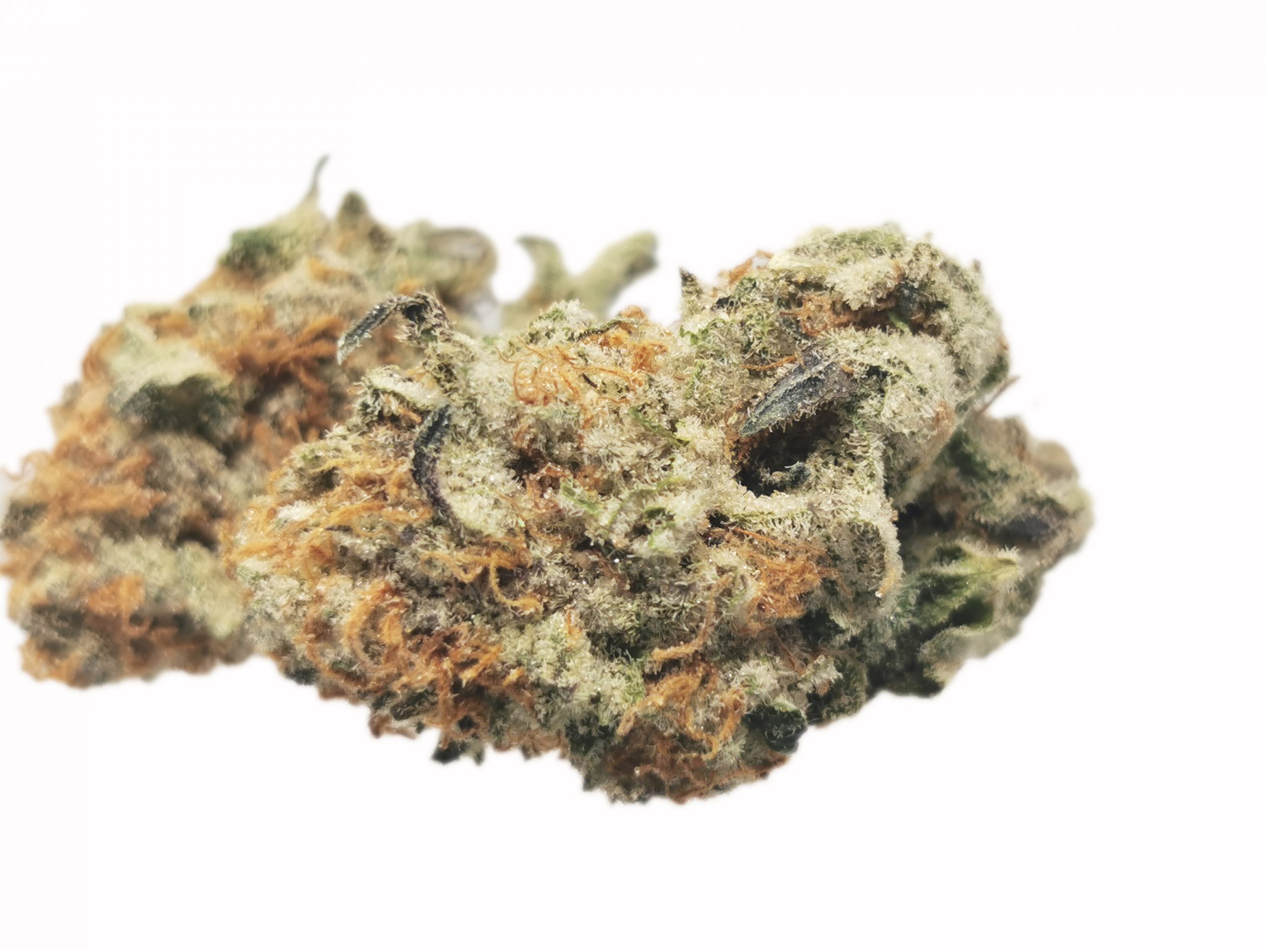 This extremely caked out nugs has long grape-shaped olive green nugs with bright red-orange hairs and a coating of thick frosty white purple-tinted crystal trichomes.