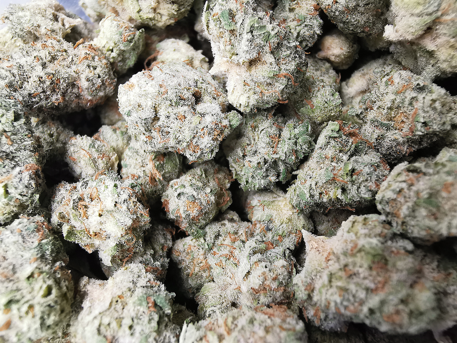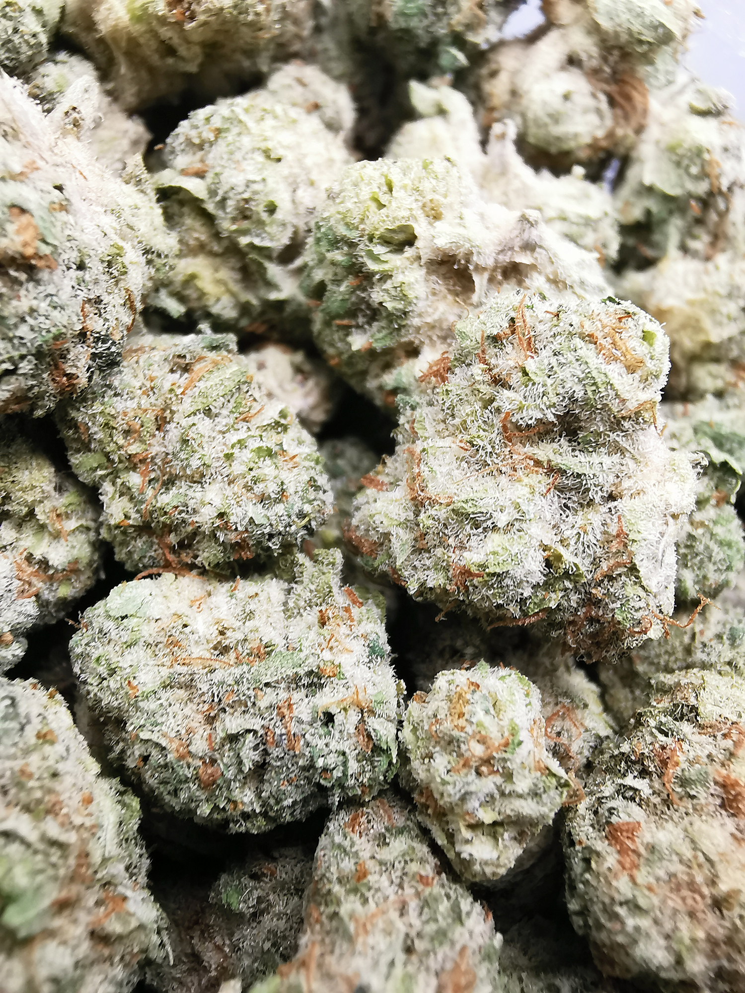 Runtz is an evenly balanced hybrid strain (50% indica/50% sativa) created through a delicious cross of the infamous Zkittlez X Gelato strains. Named for the iconic candy, Runtz brings on a super delicious fruity flavor with tropical citrus and sour berries galore. The aroma is very similar, although with a sharp spicy pineapple effect that turns slightly pungent as the sticky little nugs are broken apart and burned. The Runtz high comes roaring in a few minutes after your final toke, first hitting your head with a calming lift before spreading its tingly tendrils throughout the rest of your body. As the Runtz high expands, you’ll begin to feel a deeply calming effect spread through your limbs, leaving you totally sedated and couch-locked, immovable for hours and hours on end before you finally fall into a deep and peaceful sleep. Thanks to these effects and its super high 19-29% average THC level, Runtz is often said to be perfect for treating conditions such as insomnia, chronic pain, appetite loss or nausea and chronic stress or anxiety. This bud has dense grape-shaped olive green nugs with thin orange hairs, dark purple undertones and a coating of frosty tiny white purple-tinted crystal trichomes.