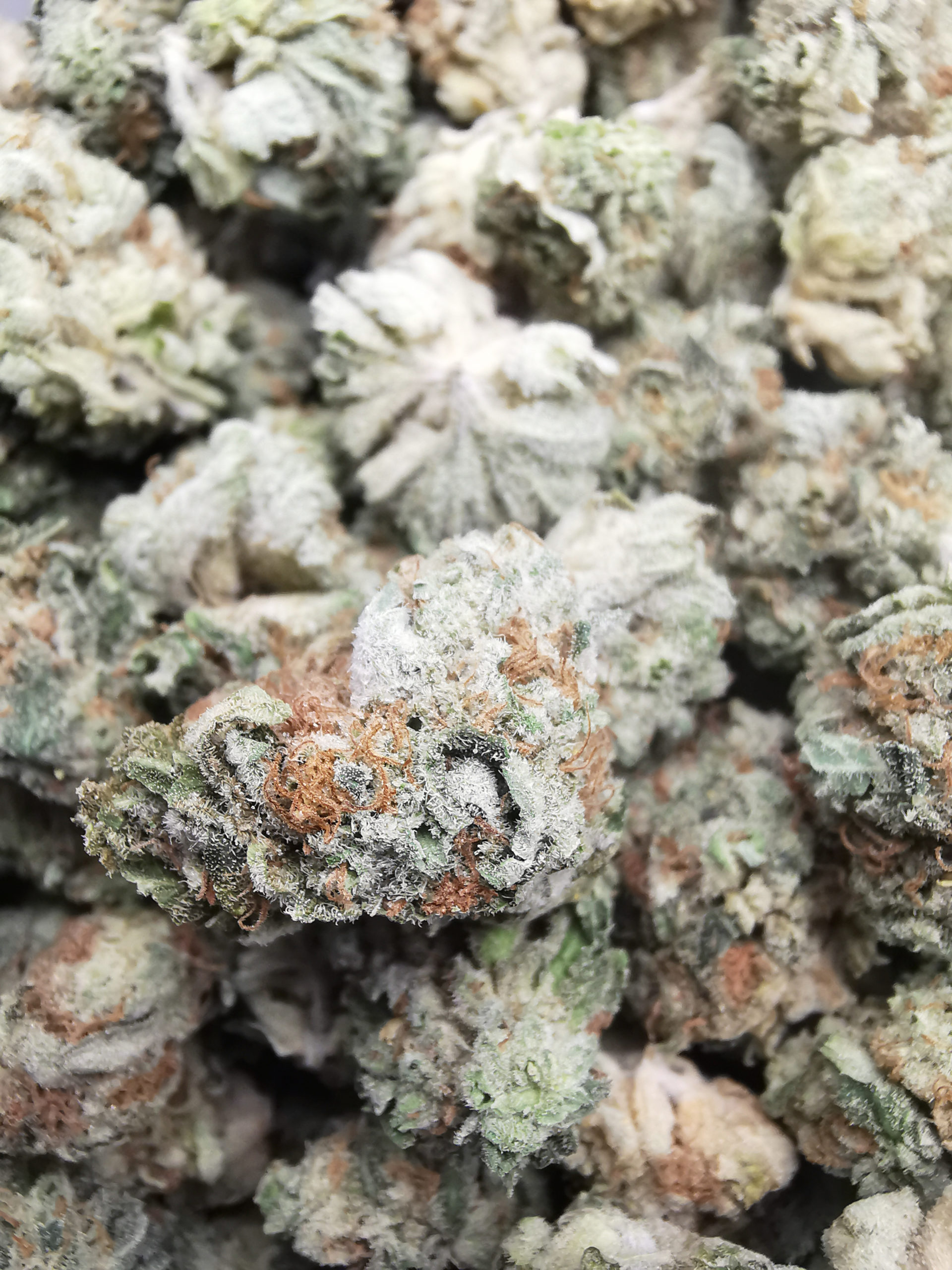 Sugar Breath is a rare indica dominant hybrid strain (70% indica/30% sativa) created through crossing the infamous Do-Si-Dos X OG Kush Breath strains. Fans of a super delicious flavor look no further – Sugar Breath has everything you’ve been dreaming of and more. This baby packs a super sweet and spicy vanilla cinnamon cookie flavor into each and every fruity toke. The aroma is of sugary diesel and fragrant florals, all wrapped up with a cinnamon vanilla overtone that is incredibly sweet. The Sugar Breath high will have you just as hooked as the taste, with long-lasting effects that end in a heavily relaxing couch-lock and pretty sedative peacefulness in both mind and body. You’ll feel a cerebral onset that lifts the spirits without causing an increase in your energy level in the slightest. As your mind lifts and drifts into unfocused happiness, your body will begin to drop off into a deeply relaxing couch-locked state that leaves you immovable for hours and hours on end. With these effects and its high 20-26% average THC level, Sugar Breath is often said to be perfect for treating conditions such has chronic pain, muscle spasms or cramps, chronic stress or anxiety and insomnia. This bud has oversized rounded olive green nugs with thin light orange hairs and a coating of chunky frosty white crystal trichomes.
