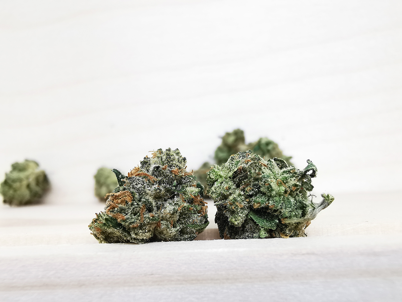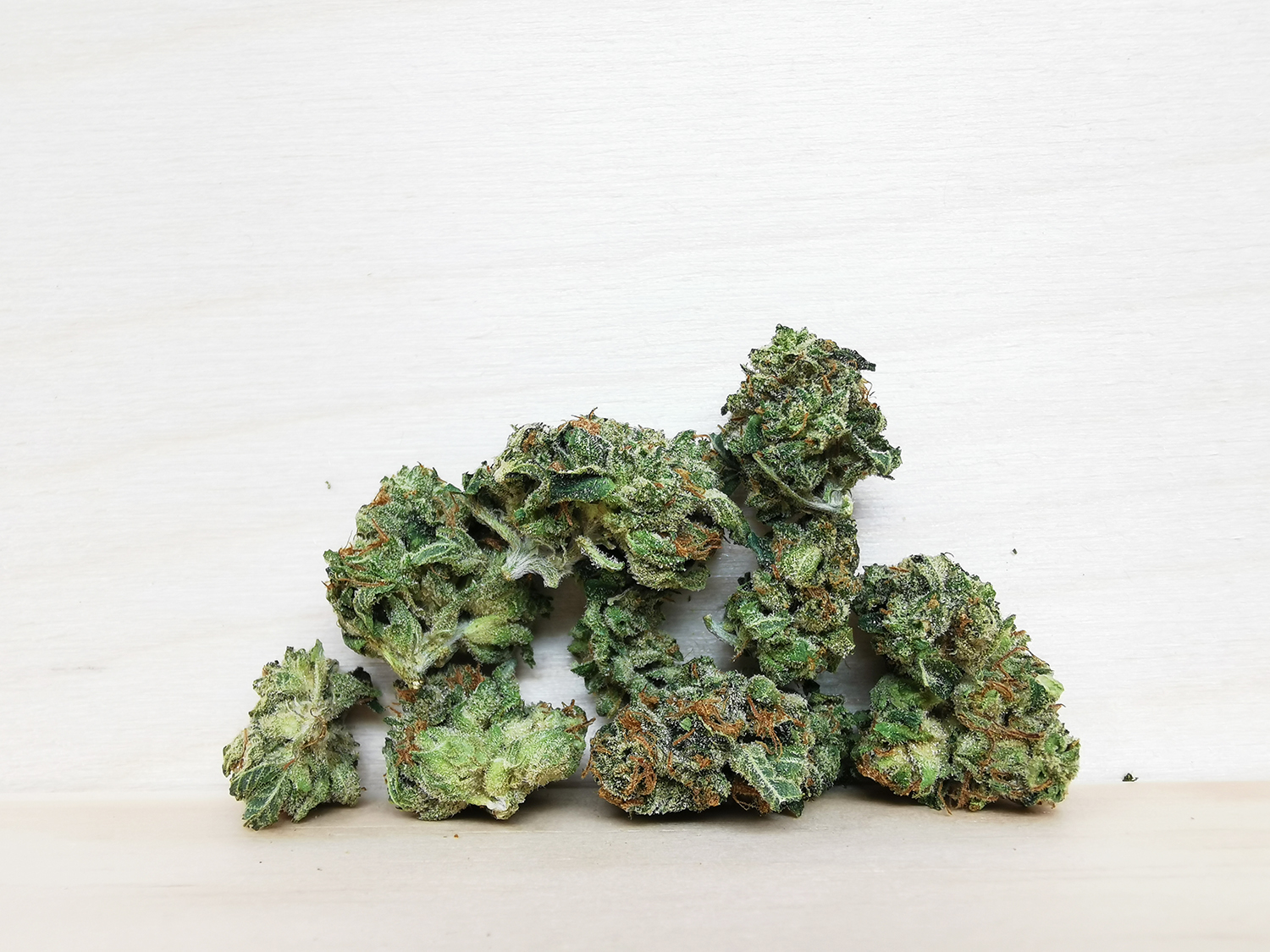 These small buds look great, dense with nice bright green and orange tones. smells kinda skunky and piney thanks to its OG parent.