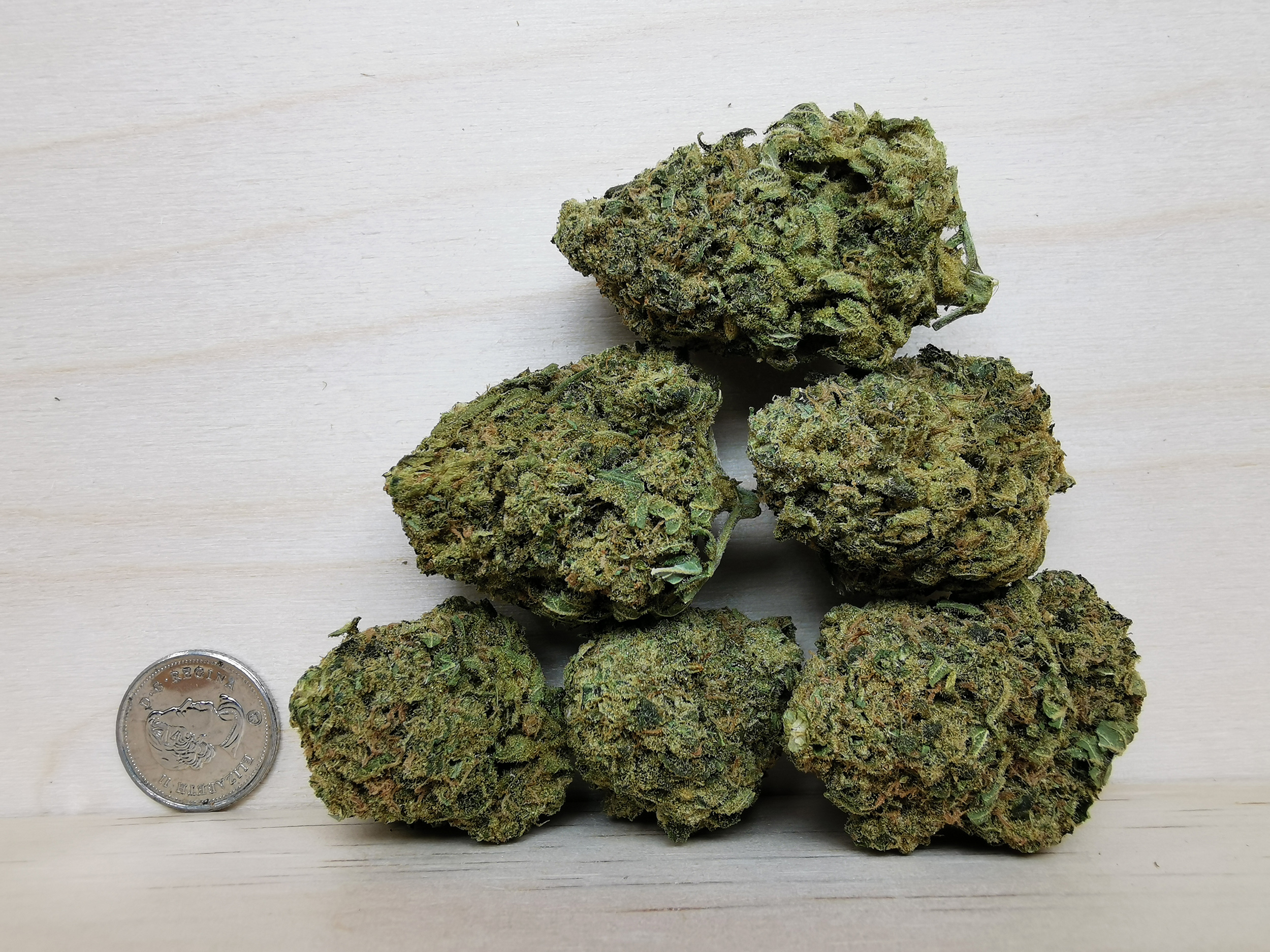 Indica strain, caked and nose is pine and skunky, light green nuggets