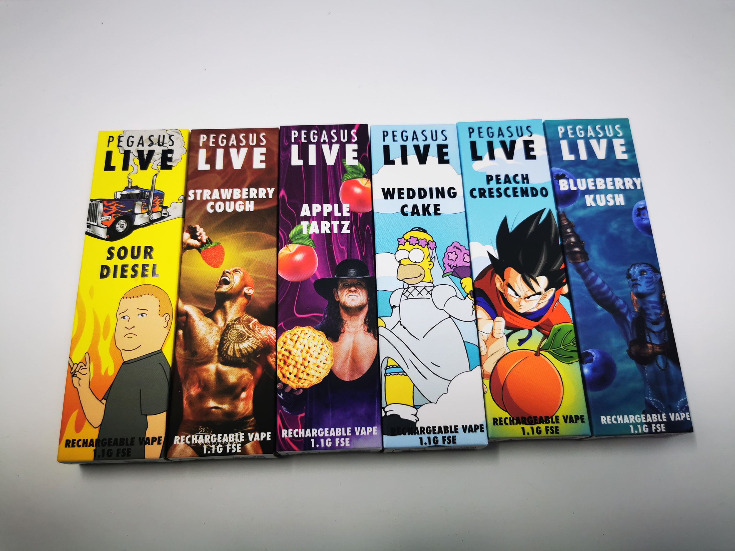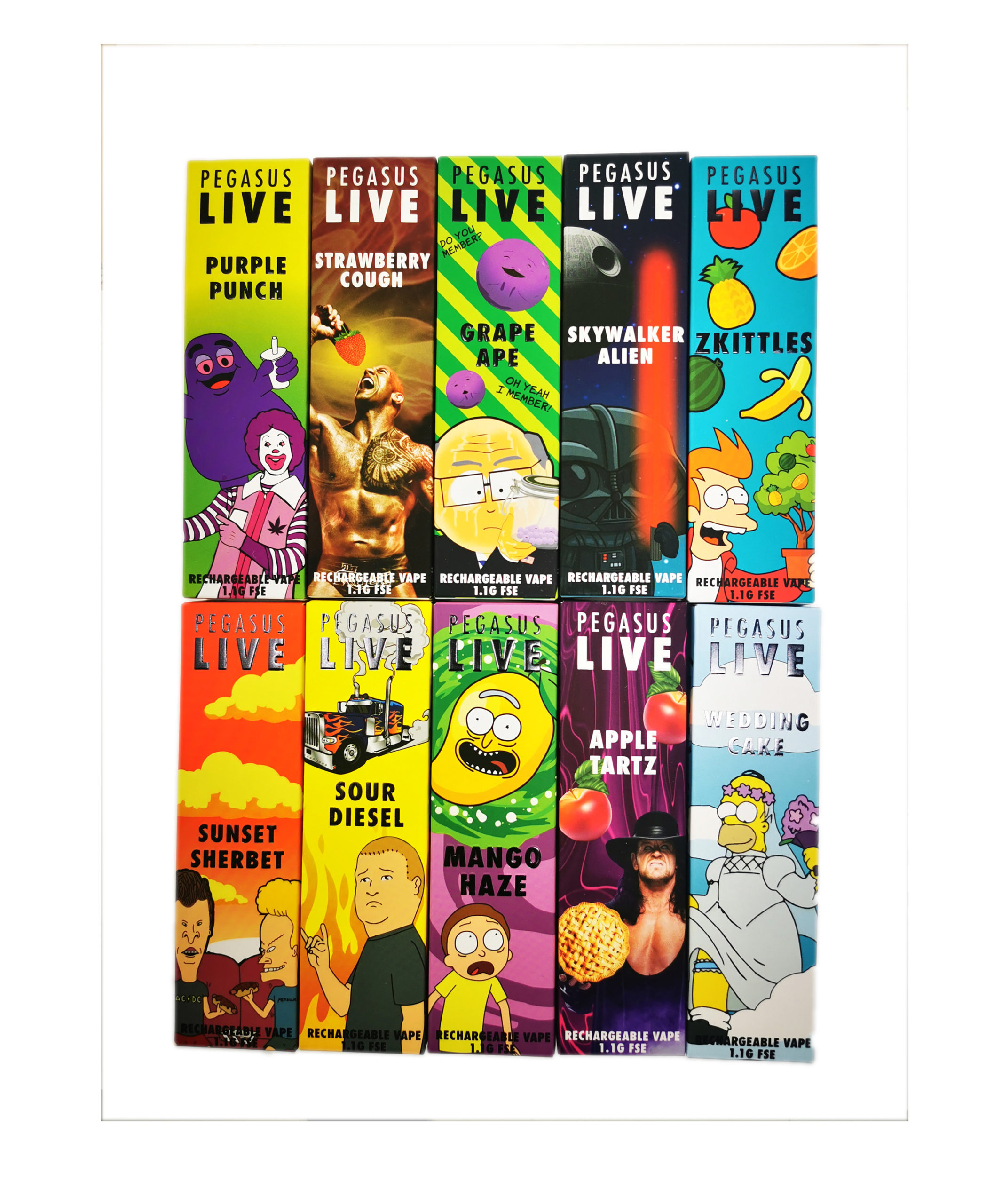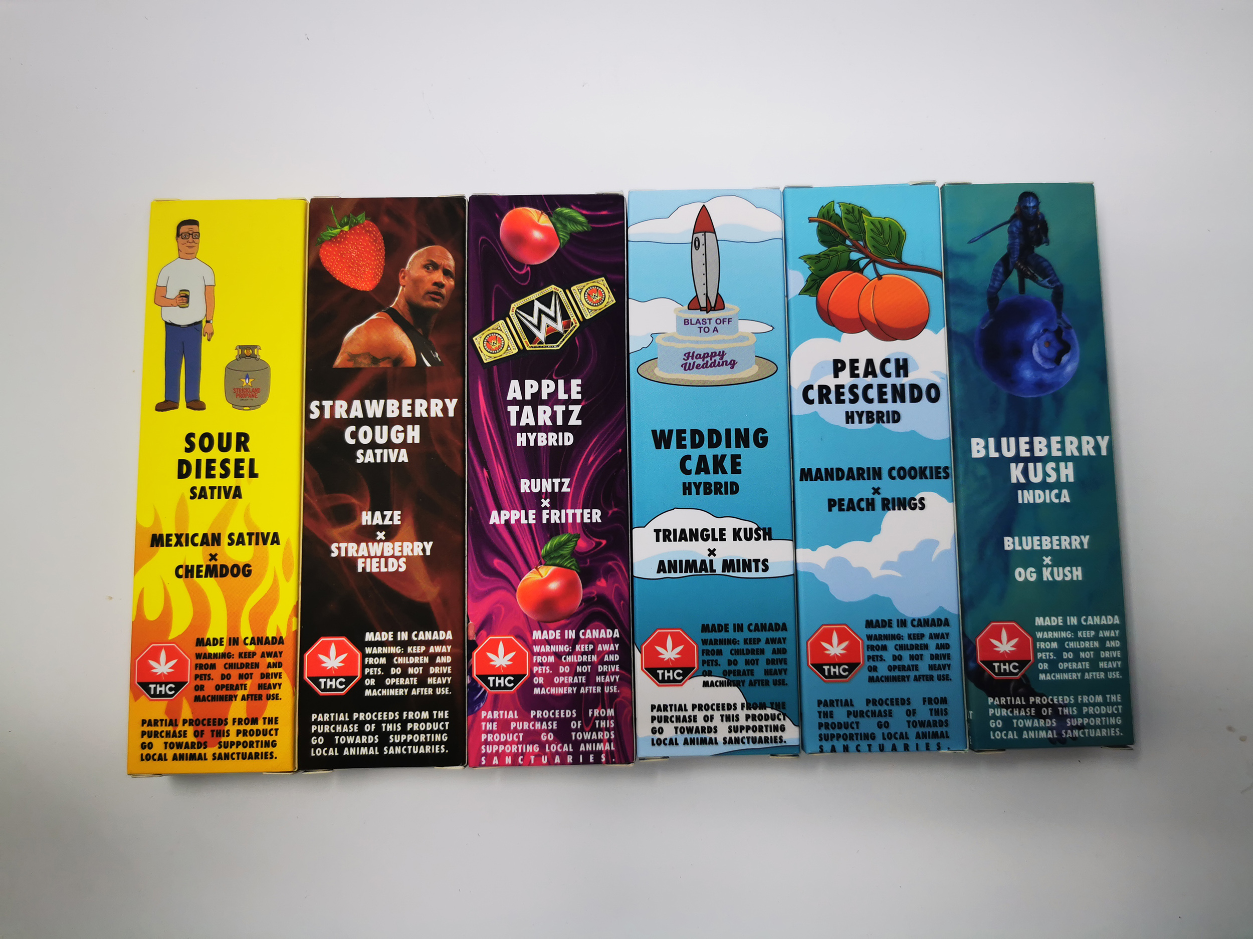 Pineapple Express | Sour Diesel | Girl Scout Cookies | Apple Tartz |Mango Haze | Zkittles | Sunset Sherbet | Purple Punch | Skywalker Alien | Cherry Chem | DeathBubba | Grape Ape | Blueberry Kush | Strawberry Cough | Wedding Cake