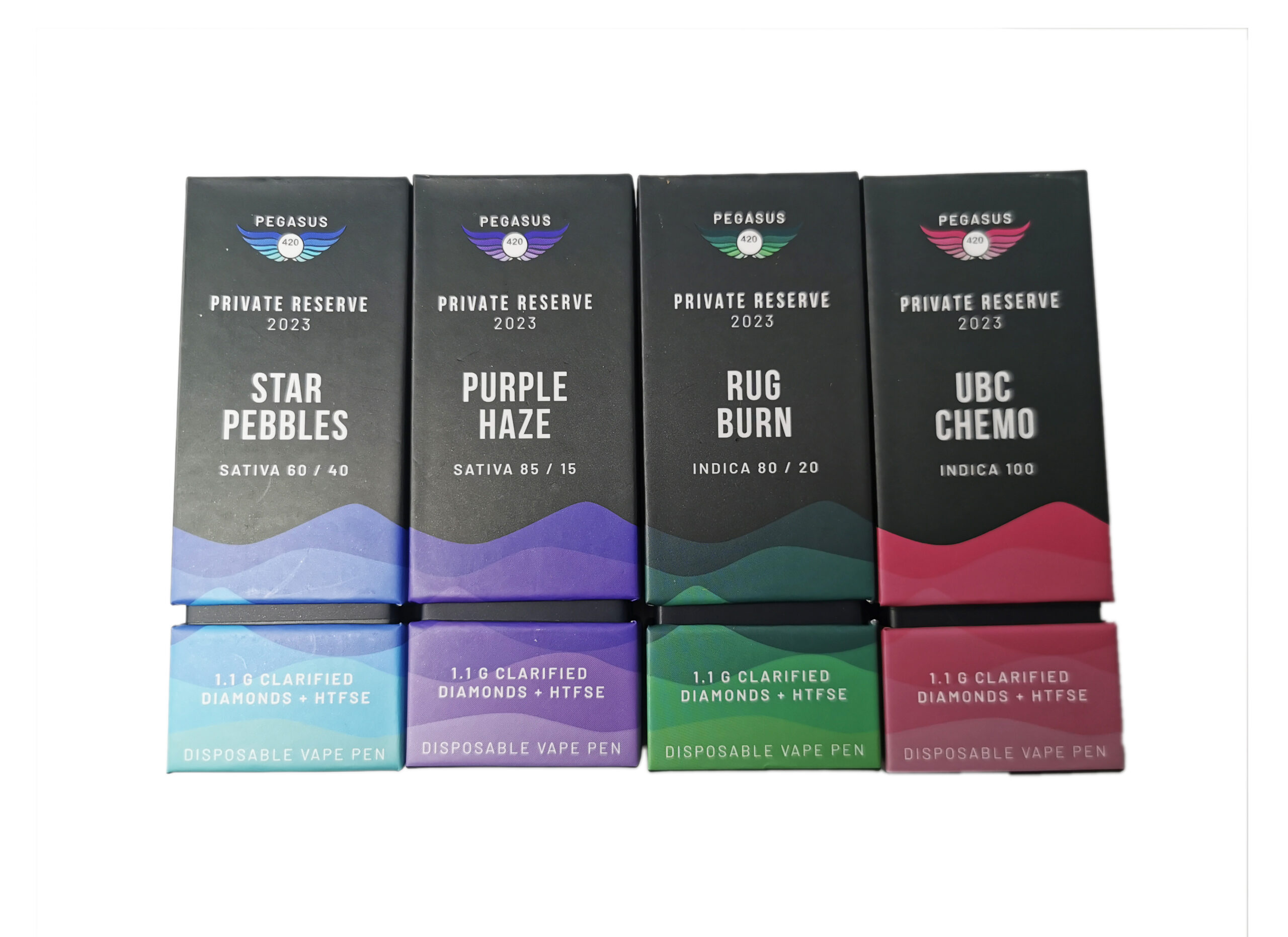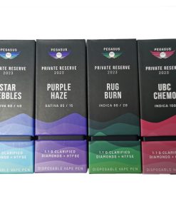 Pegasus420: Private Reserve 2023 1.1g Vapes contains Clarified Diamonds & HTSFE. These vapes are Limited Edition, small batch releases of their personal favourite strains and extractions. Full Spectrum. Single Strain. No Additives.