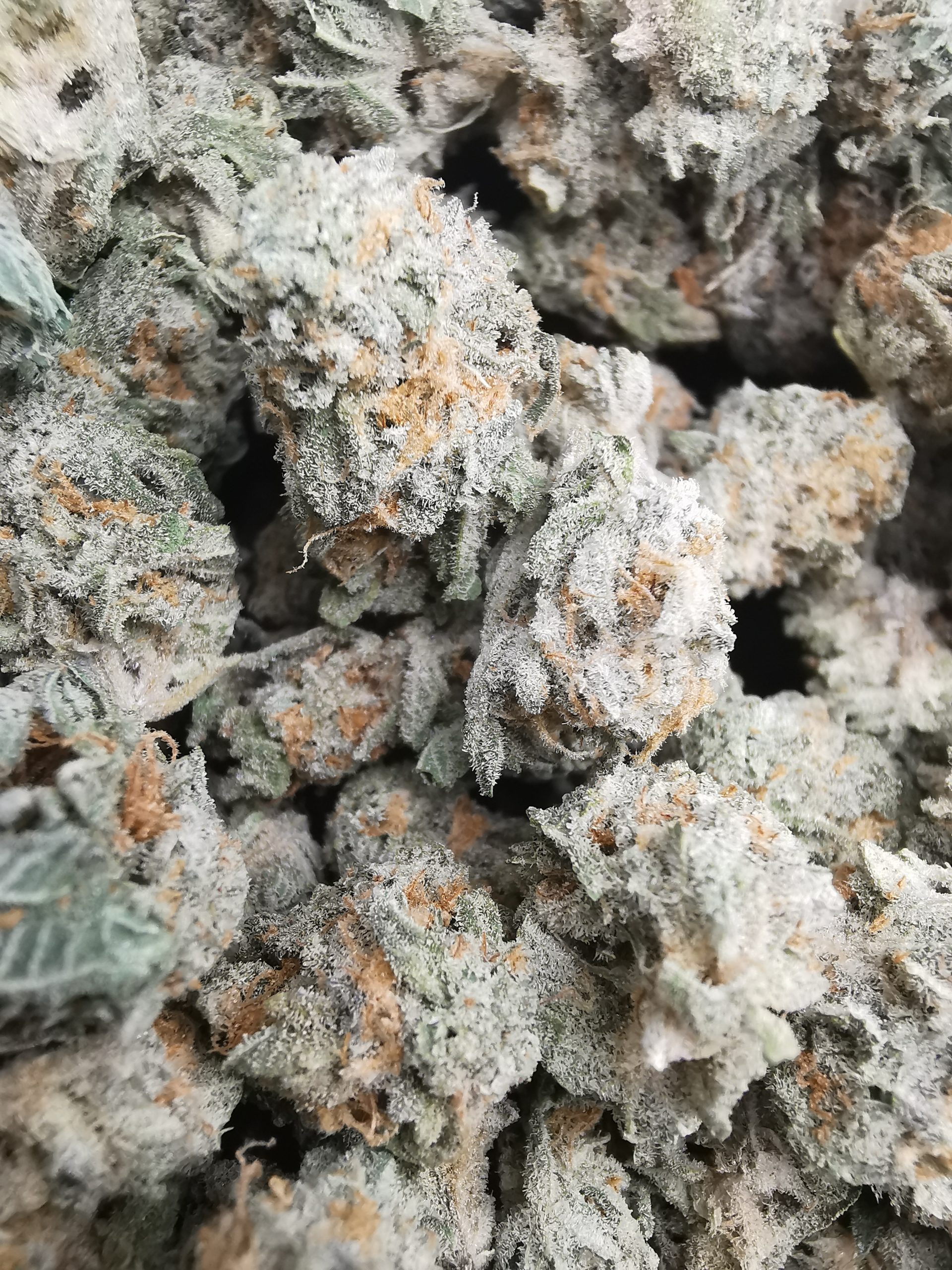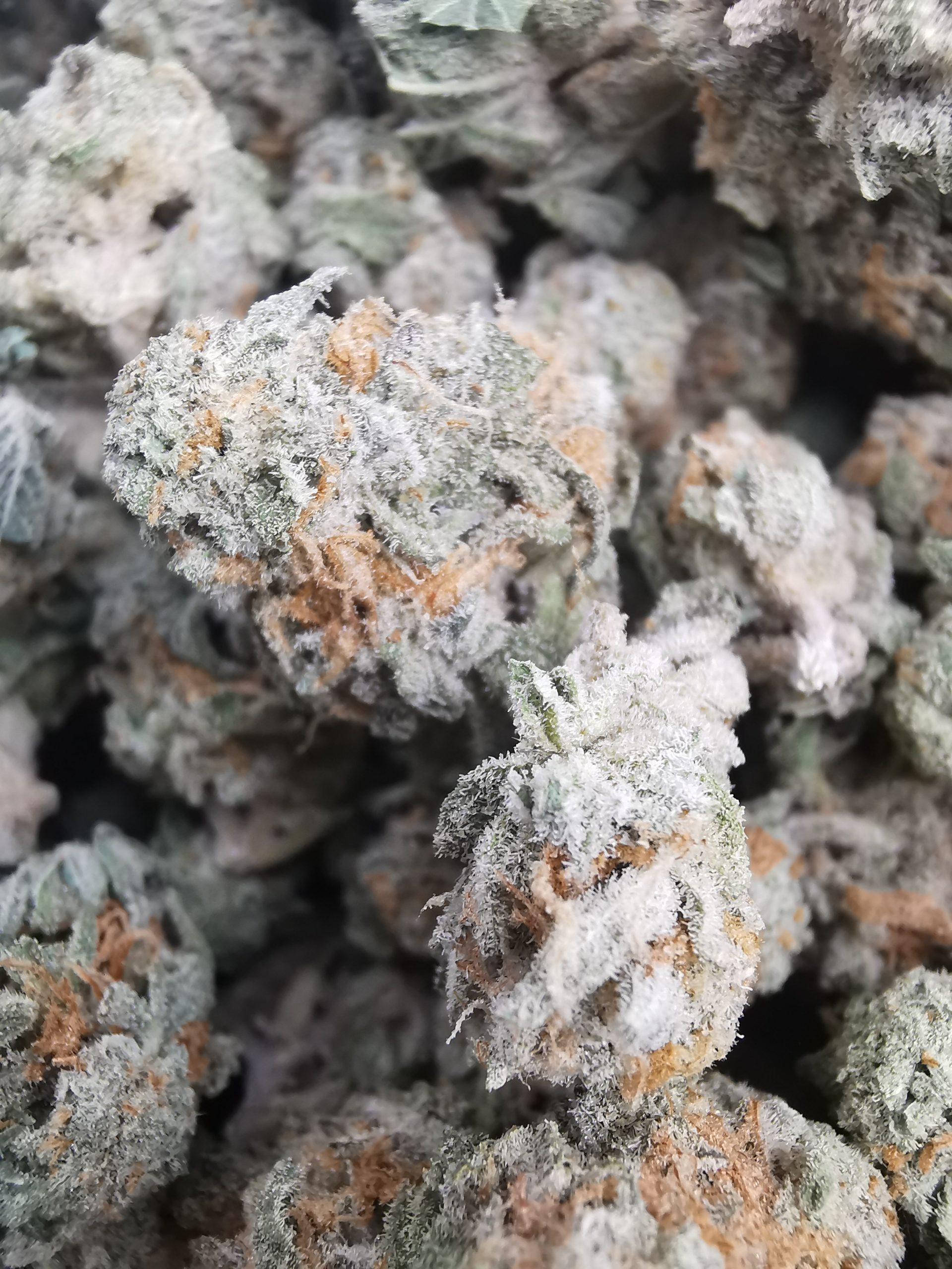 Pie Face OG is a slightly Indica dominant (60% Indica /40% Sativa) strain created through crossing the classic Cherry Pie X Face Off OG strains. With a highly addictive sweet cherry hash flavor and a myriad of clear-headed effects, Pie Face is the perfect choice for any patient who loves an indica relaxation paired with cerebral clarity. The high starts with a focused euphoric lift that leaves you feeling slightly energized and creative. You’ll be highly aware of everything around you and pretty talkative, chatting with anyone about the little details of things that you notice. You’ll get a hefty case of the munchies as the high builds, although you might find yourself coming up with creative concoctions of different foods and flavors to satisfy your hunger. Pie Face is said to be perfect for treating conditions such as chronic stress or anxiety, depression, appetite loss, and insomnia. The smell of Pie Face is much like its flavor, with a sweet cherry aroma accented by sweet earthy berries and hash. Pie Face buds have tight long light minty green nugs with sparse orange hairs and bright golden crystal trichomes.
