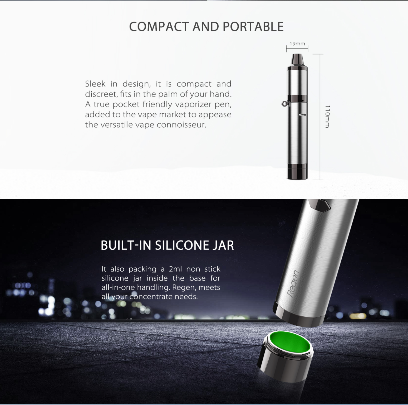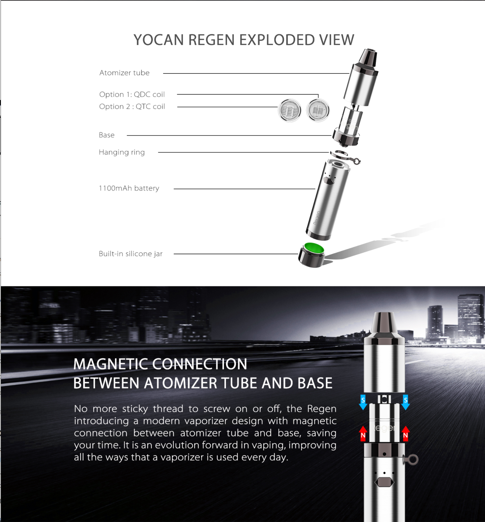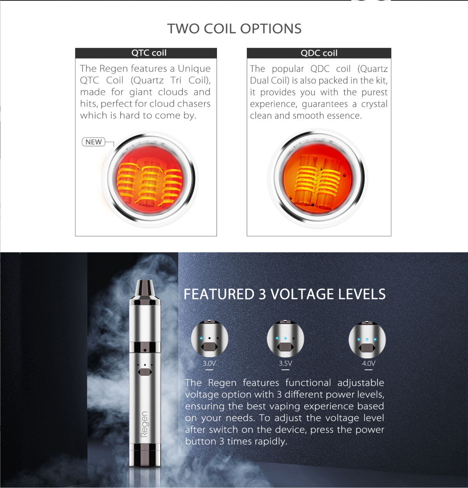 The Yocan Regen Vaporizer is a simple device that proves to be a solid alternative vaporizer The Regen features Yocan’s QTC technology, Built-in Silicone Jar and a magnetic connection. The device itself features a single power and adjustment button turning the device on and off with five clicks. To adjust the voltage output of the device is as simple as clicking the same button three times. This, in turn, will light up the three LED’s located just above the single tactile button. When one light is activated the device is in its lowest setting. When all three are activated the device will be at its highest output.