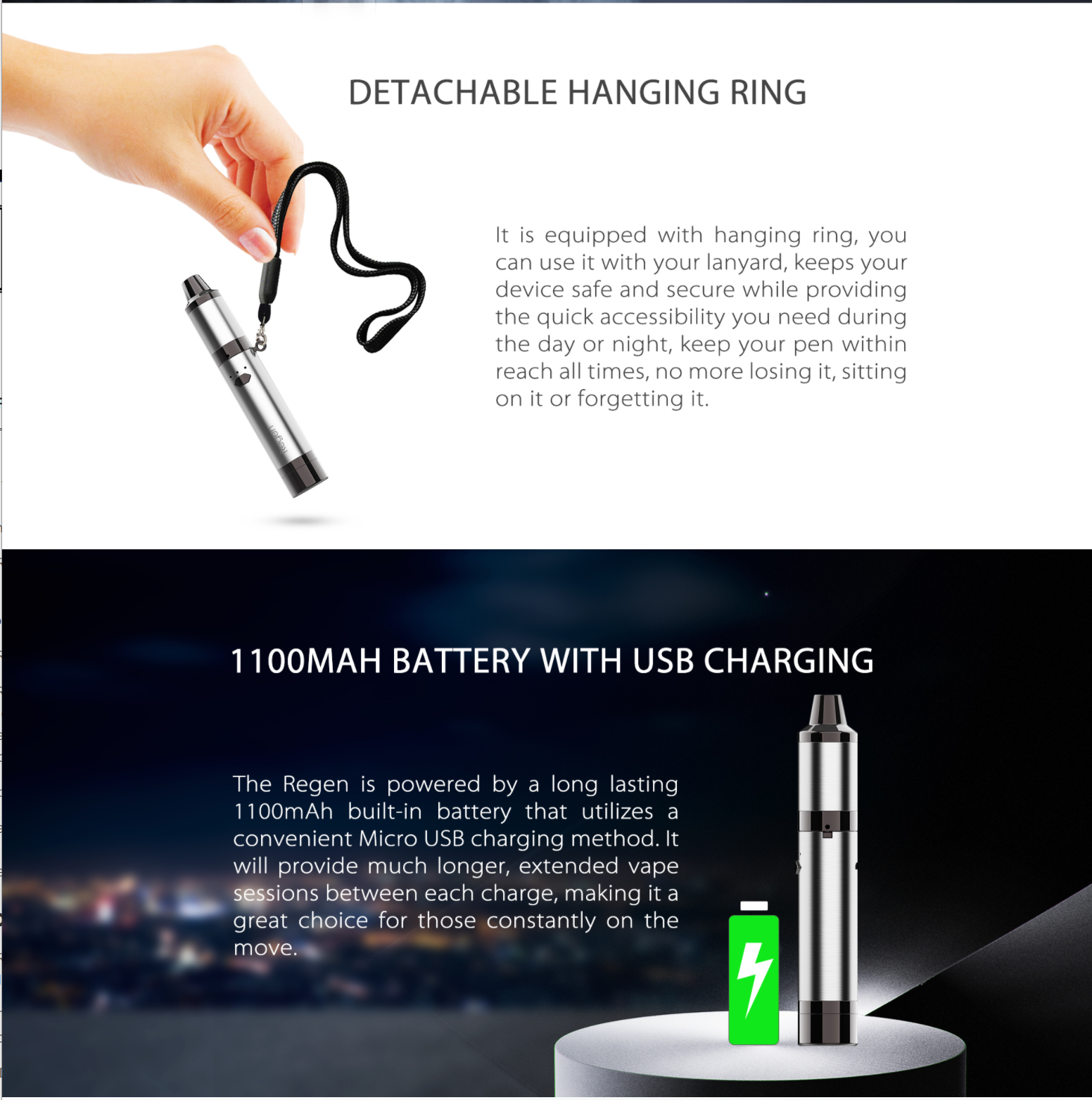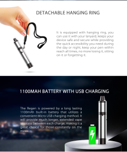 Included in the packaging is not only the Regen Device but also the Atomizer Tube, Coil Cap and QTC Coil. With all of these items, this ensures users receive all of the pieces to get started and maintain their device. The Regen also features an all in one silicone jar. This allows users to store extra media within the base of the device itself. The material used is silicone lined screw-on base with fine threads allowing for smooth removal. The ceramic heating element features a reverse airflow system creating a premium experience. The Regen device features a 1100mAh built-in battery with a micro USB cable allowing for simple and fast charging. The Regen also features a LED indicator providing instant feedback to the battery state and power output. With what is arguably one of the most comfortable designs available in the market, the Regen by Yocan is one of the most premium vaporizer systems in this market segment, combining amazing battery life, easily exchangeable atomizer system, a quality build and ease of use.