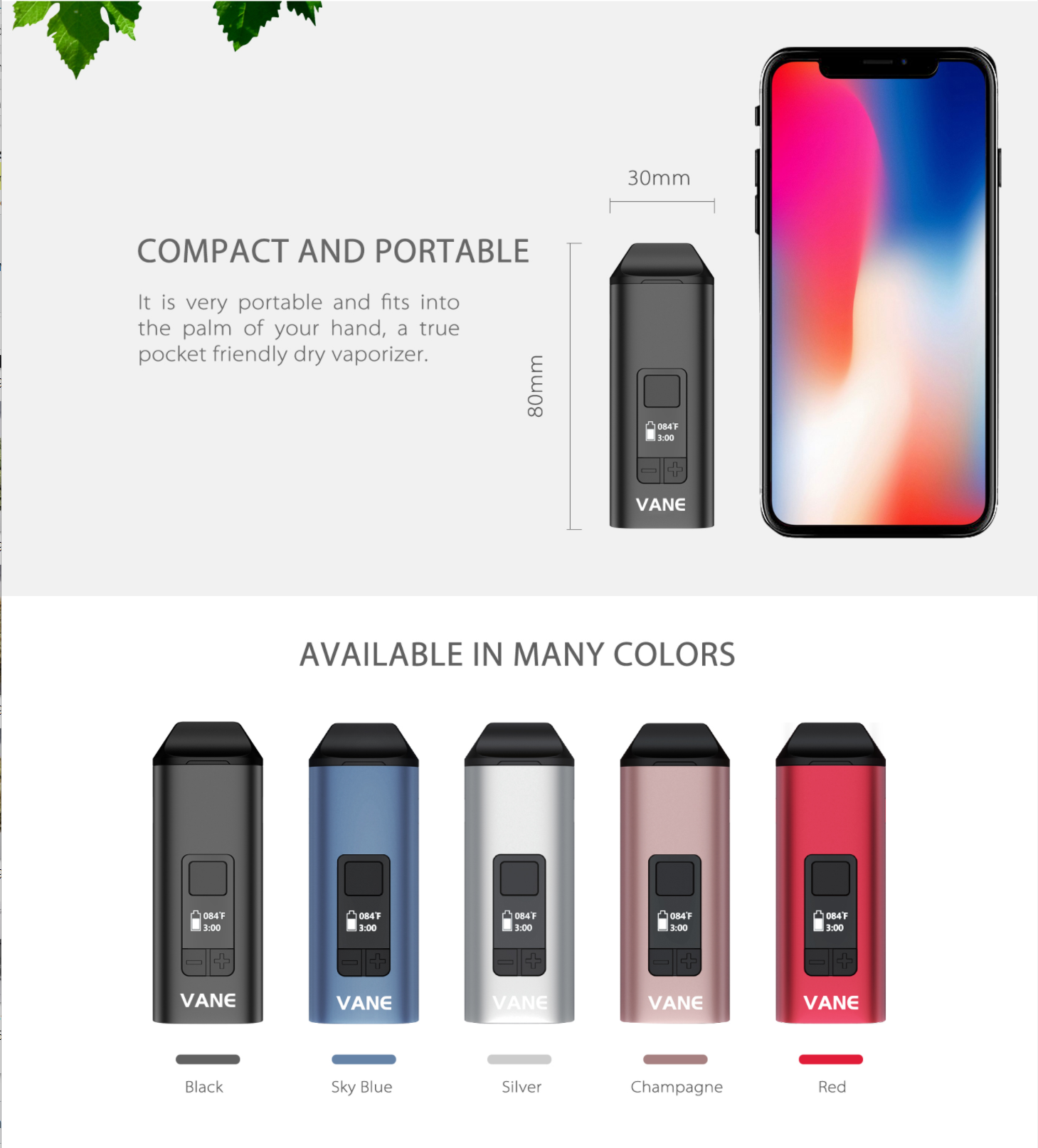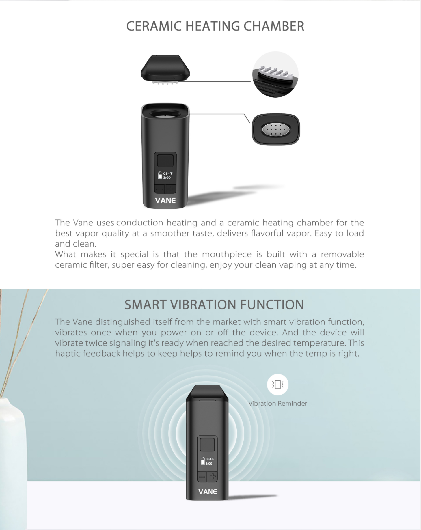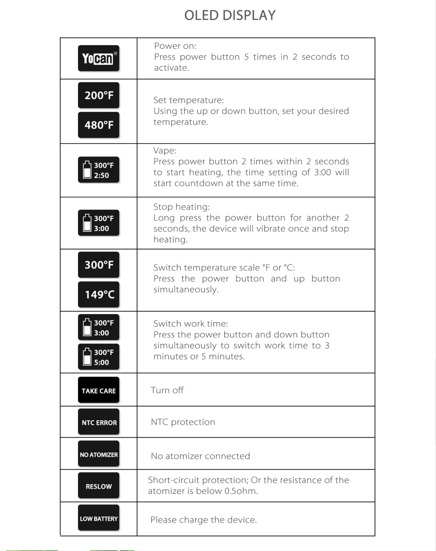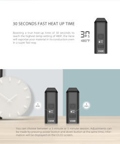 - Two vaping options: 3 minute or 5 minute session